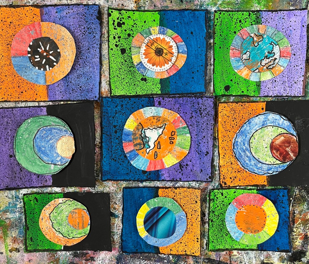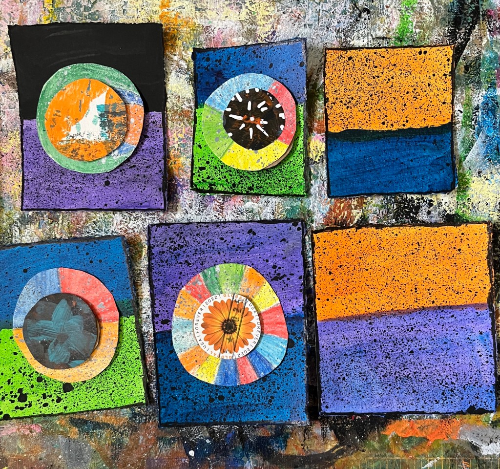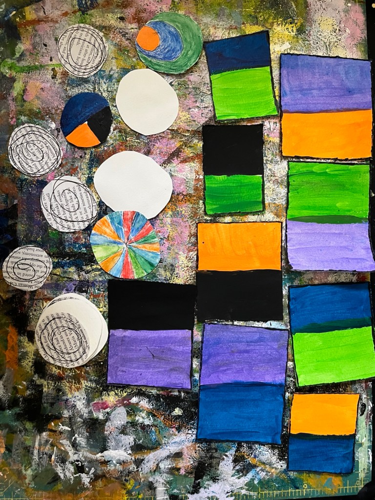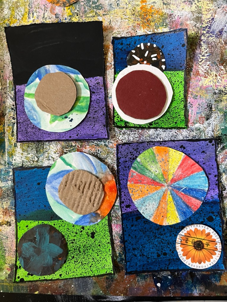 The next class, things got more interesting as we started stacking our shapes. Seeing which colors went well together, I altered some, adding black lines or white highlights. International stamps and Gelli prints came into play.
