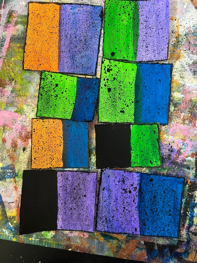 This month, we started by cutting out and painting nine rectangles of similar (but not identical) sizes and painting each of them two colors.