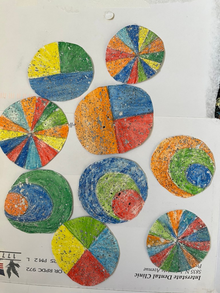 Then we cut circles that would fit into the rectangles, sectioned, and colored them. There were also circles with loosely-goosey spirals. It was an intriguing set of things, but I didn’t see it turning into much.