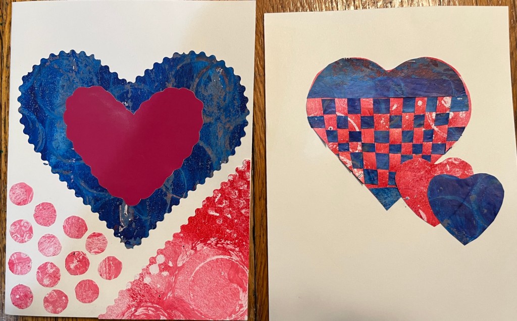 Auntie Bridgett, our friend Cynthia, and I had a fine crafty morning last week, making Valentine cards. We cut, glued, wove, pieced, drew, and painted (as our whims and talents determined) and ended up with 12 pretty nifty cards.