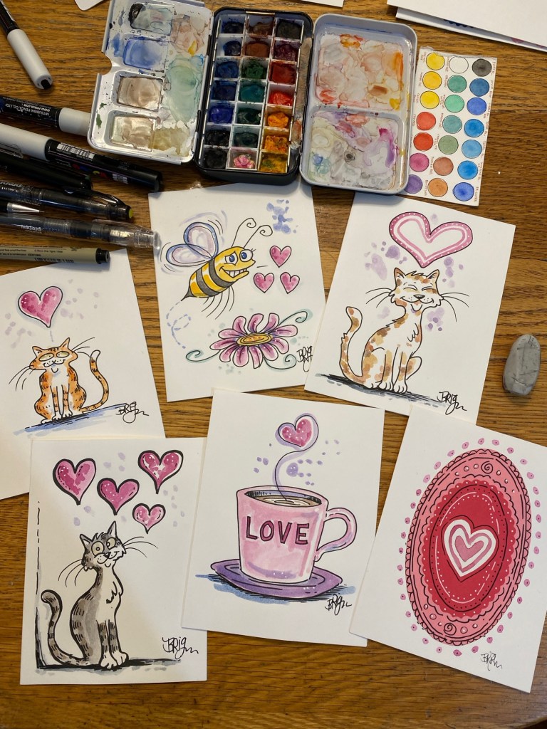 Today we will walk the cards down to Floyd’s Coffee Bar to be picked up and handed out on Valentine’s Day. This artsy do-good-ery is the sort of thing Bridgett’s character Auntie Beeswax would do, and I totally approve!