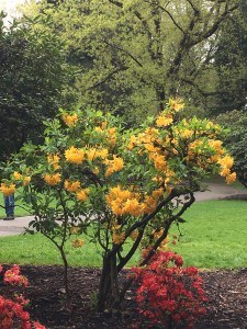 But what are really cooking right now are the azaleas. Pink. Purple. Yellow. Higher than my head or low to the ground, growing like wild animals in the park or tightly pruned in a small yard, the color is intense and fabulous.