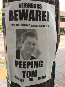 A metal garden sculpture in the shape of the giant flower Audrey from “Little Shop of Horrors”. A sign with a man’s face and address, but no name, condemning him as a Peeping Tom. A sticker on a crossing button that says “You are way more important than your realize.”