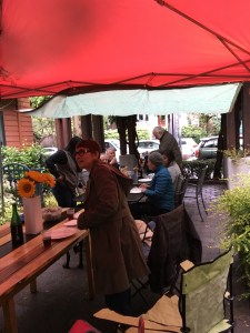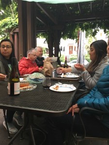 What a pleasant evening! We all kept our jackets on, but we shed hats and got cozy. As the new people, we were trying to learn everyone’s names while eating all the delicious food. There was a fine roast beef, pasta with meat sauce, a rice and artichoke casserole, and chicken shish kabobs and our contribution, broccoli salad. There was white wine, red wine, sparkling wines, and even a red ale that tasted almost like cherry coke.