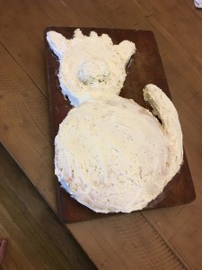 I walked over to their house in Ladd’s Addition early Sunday morning to help Auntie Katie make the cake. She had gotten the hard work done already! She had baked, sliced, filled, chilled and crumb-coated this marvelous kitten cake. All I needed to do was give it a nice layer of fluffy pink frosting and watch Auntie Katie put on the face.