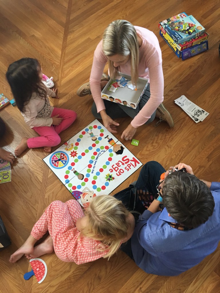 A new (to me) board game called Kids on Stage was a great hit. You roll dice, move pieces and draw cards. Each card gives you something you need to act out… a snake, a wristwatch, kicking a ball. It was perfect for the 18 months to 5 years old range of our crowd.