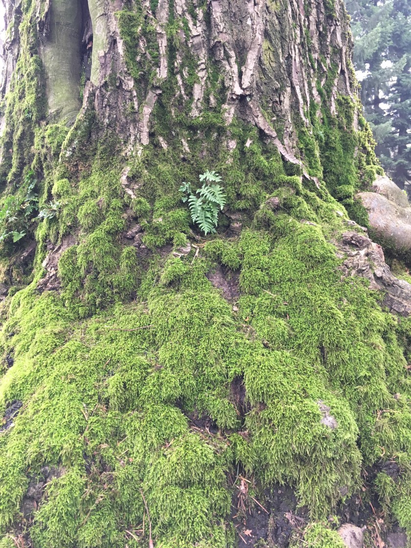 In Laurelhurst Park, where the redwoods make year-round shade, moss extends from the trunks of trees, past their roots, right across the ground. The parts of the park where mostly deciduous trees (the ones that lose their leaves) live actually have more sun in the winter, so those areas have less moss.