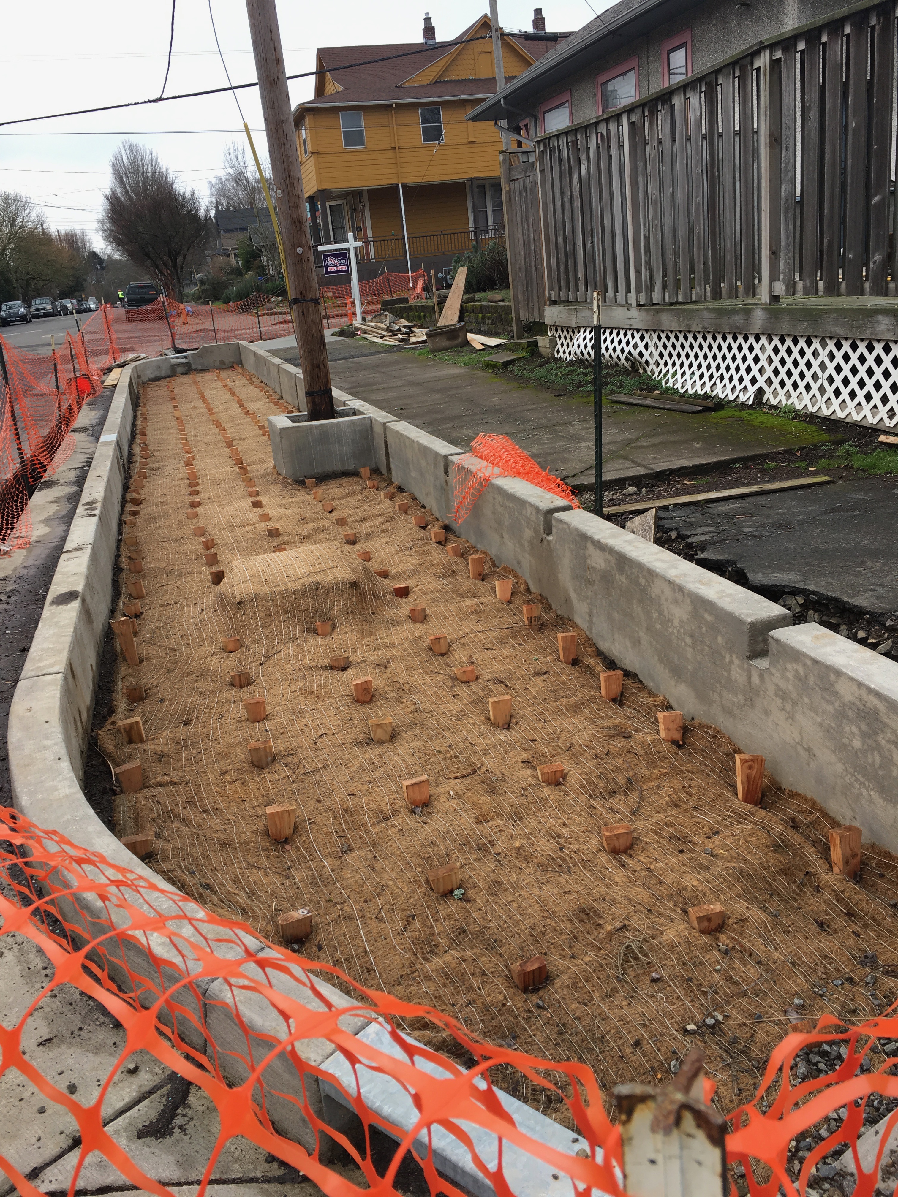 On the way home, we saw some new construction in the neighborhood. Taylor Street is getting some bioswales! I’ve told you about these… sunken gardens, lined with stones, where rain water collects and filters into the ground water. People have them in their yards, and the city of Portland installs them along the streets. They keep water from washing trash and pollutants into the Willamette River.