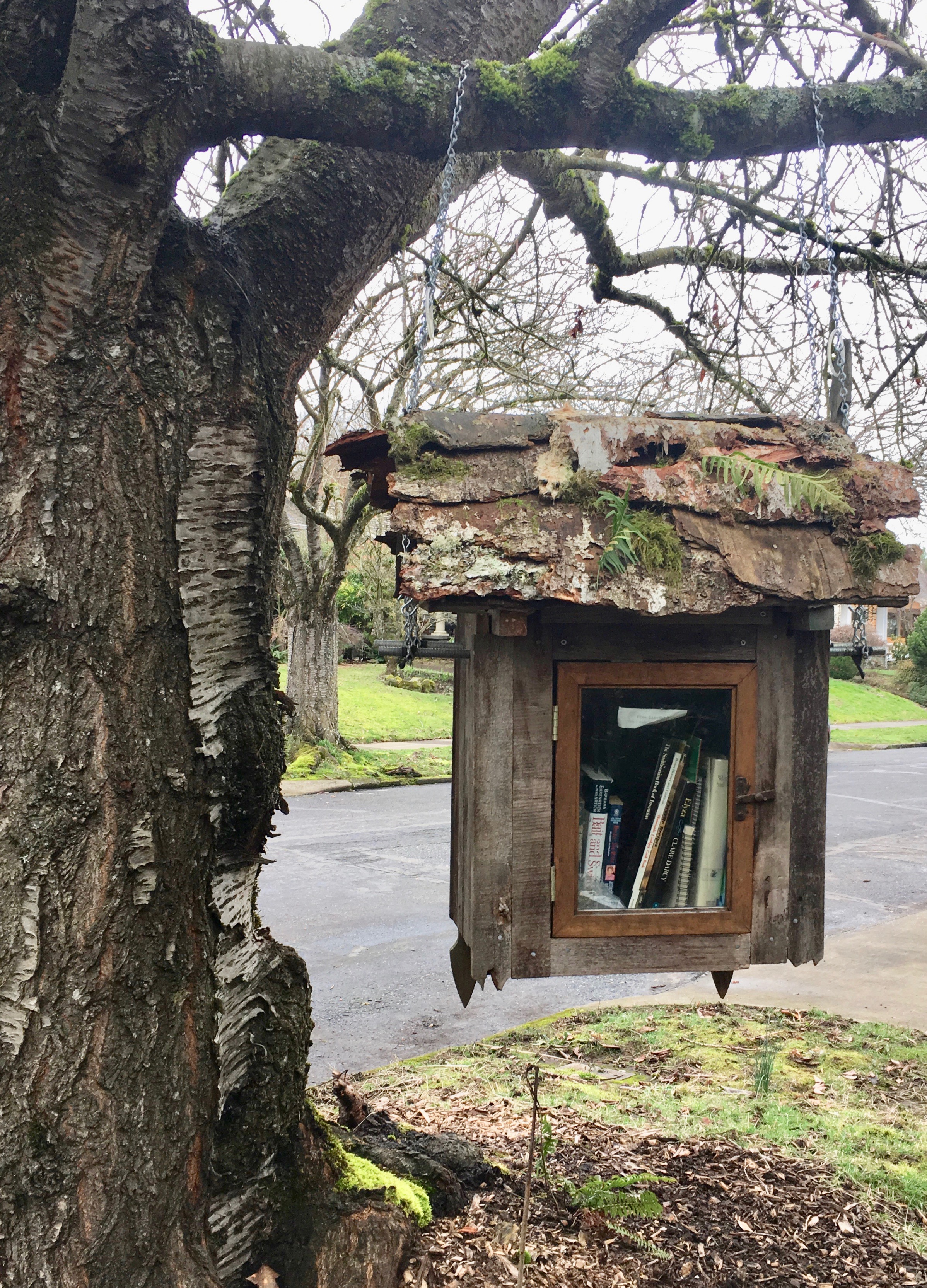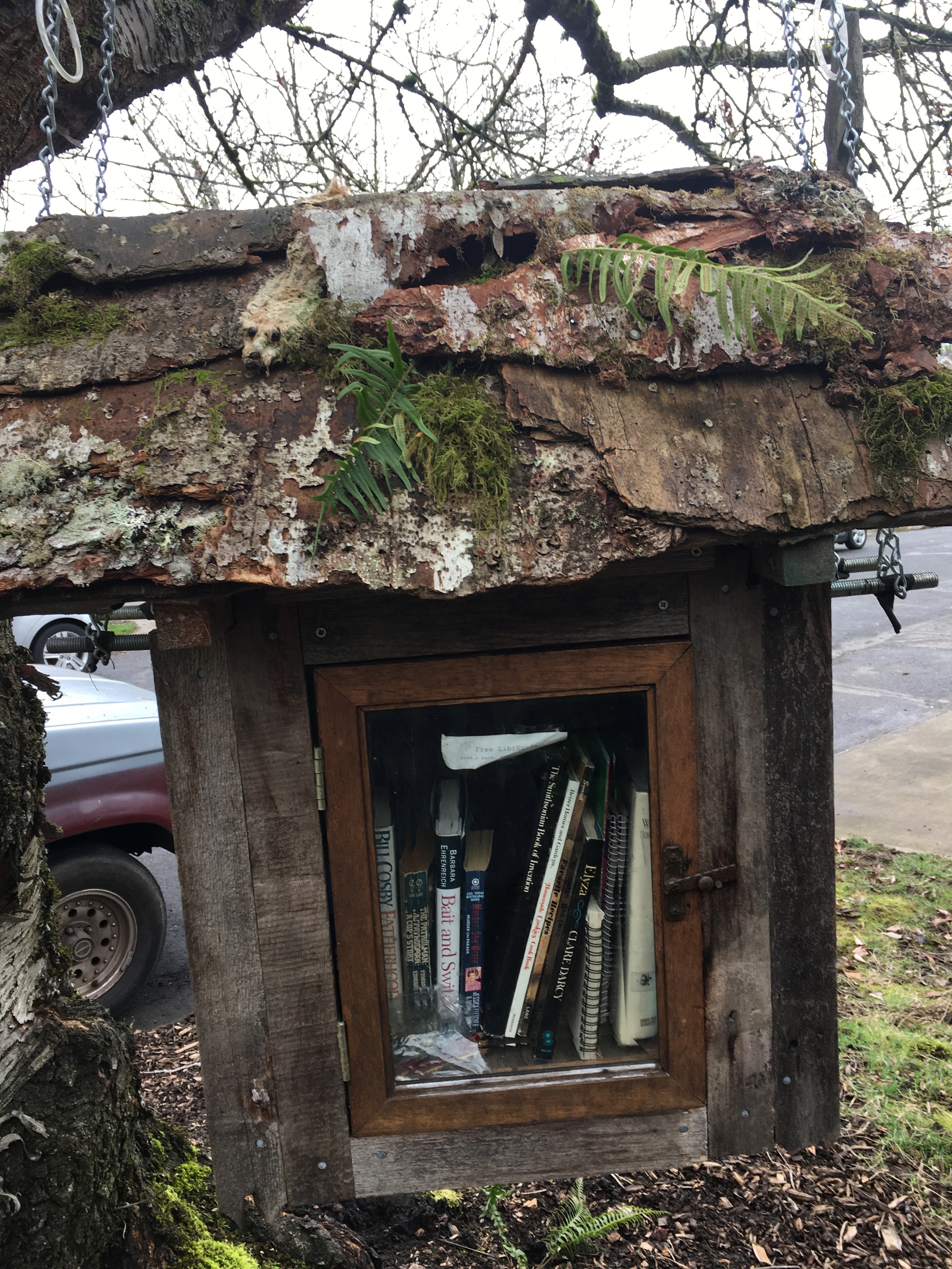 Out walking the other day, Auntie Bridgett and I found a new Tiny Library. I’ve told you about these before…small weather proof structures where people can drop off and collect books. There are a few in Salinas, but Portland seems to be a sort of epicenter.