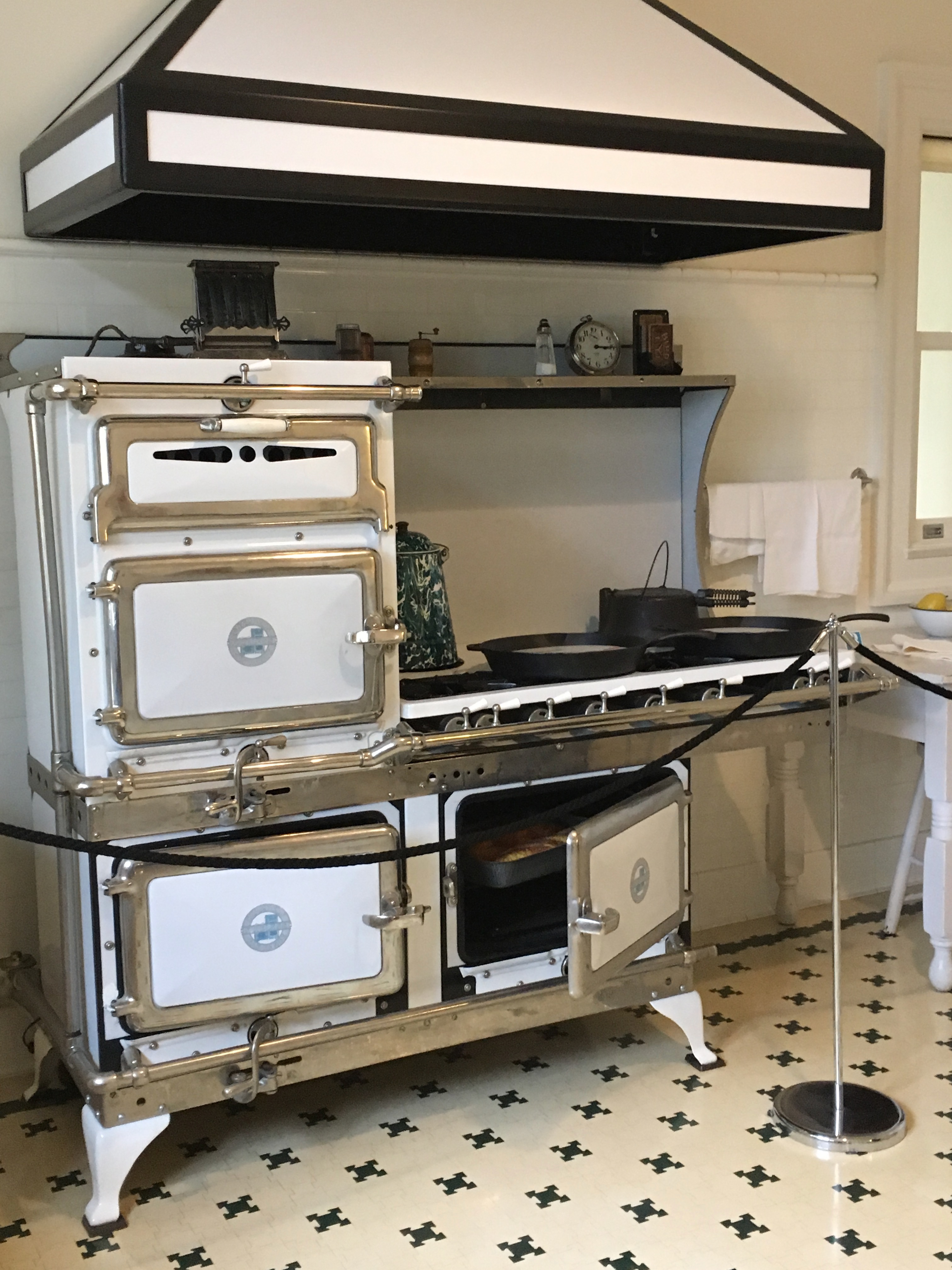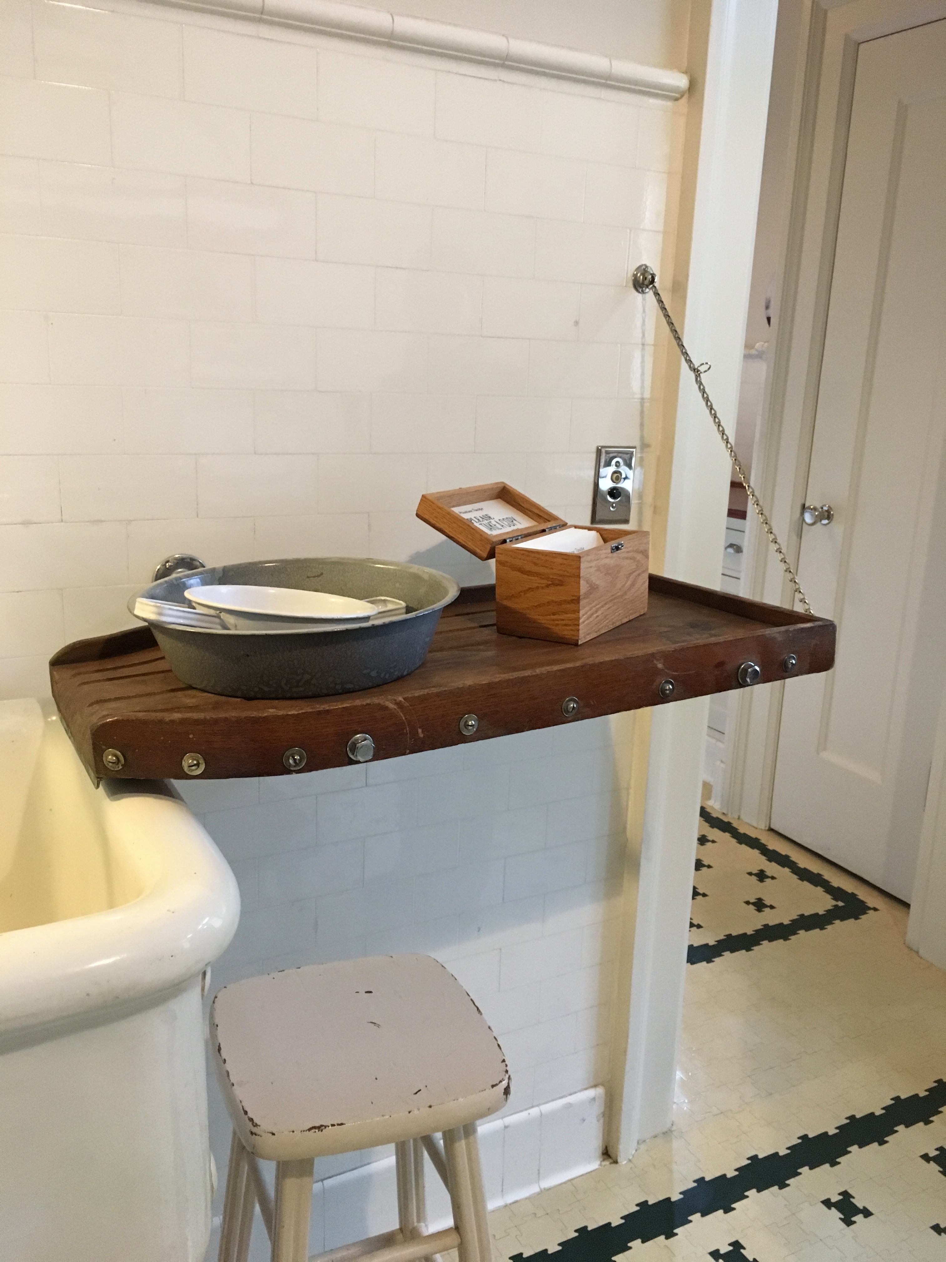 I especially enjoyed looking at the kitchen, where the finest 1915 appliances were on display. The wood burning stove looked like an iron and ceramic altar to the worship of food preparation. The sink had a suspended dish drainer that was ingenious, but seemed small for the number of dishes that would have been washed, with nearly a dozen people living in the house.