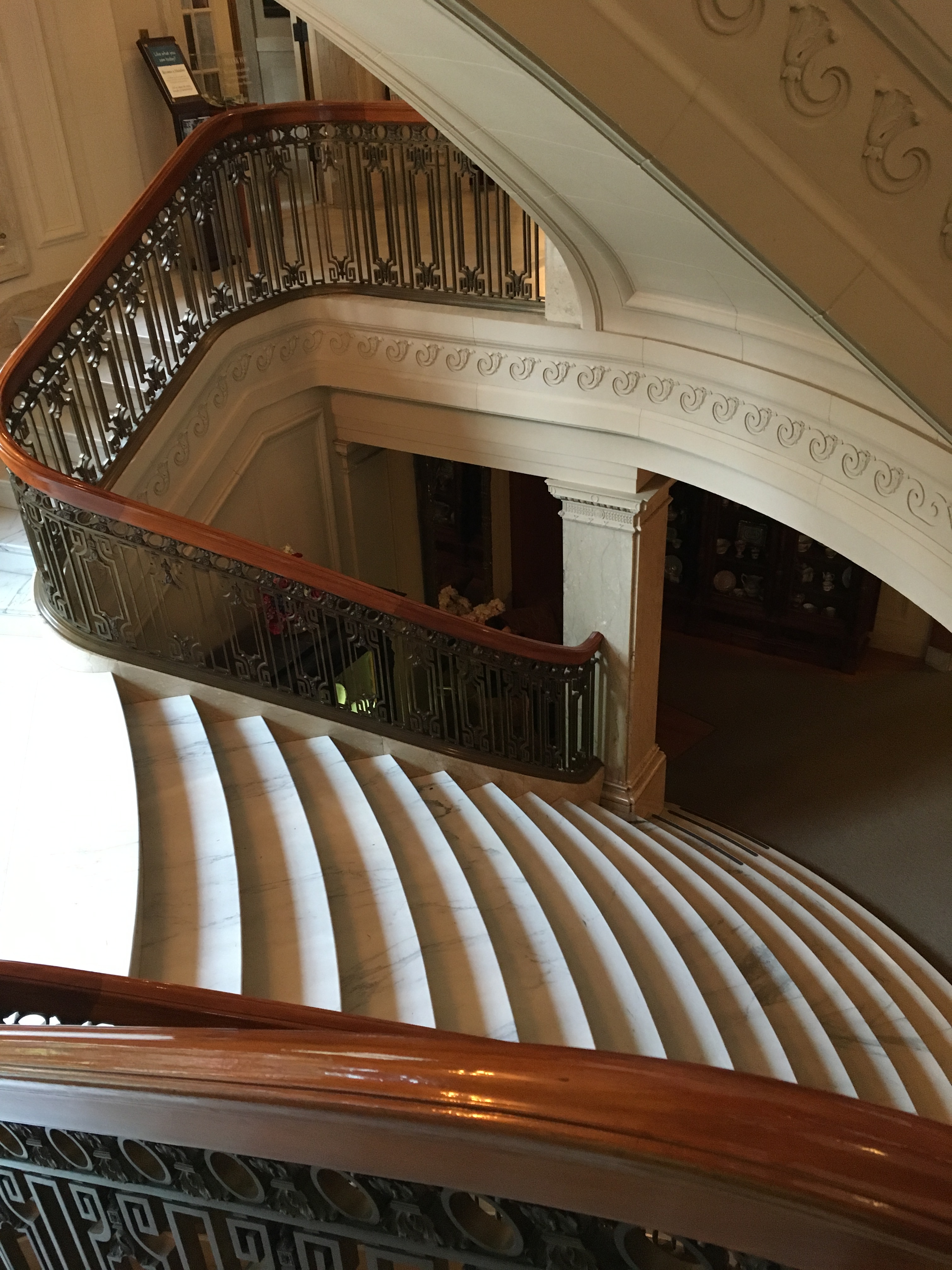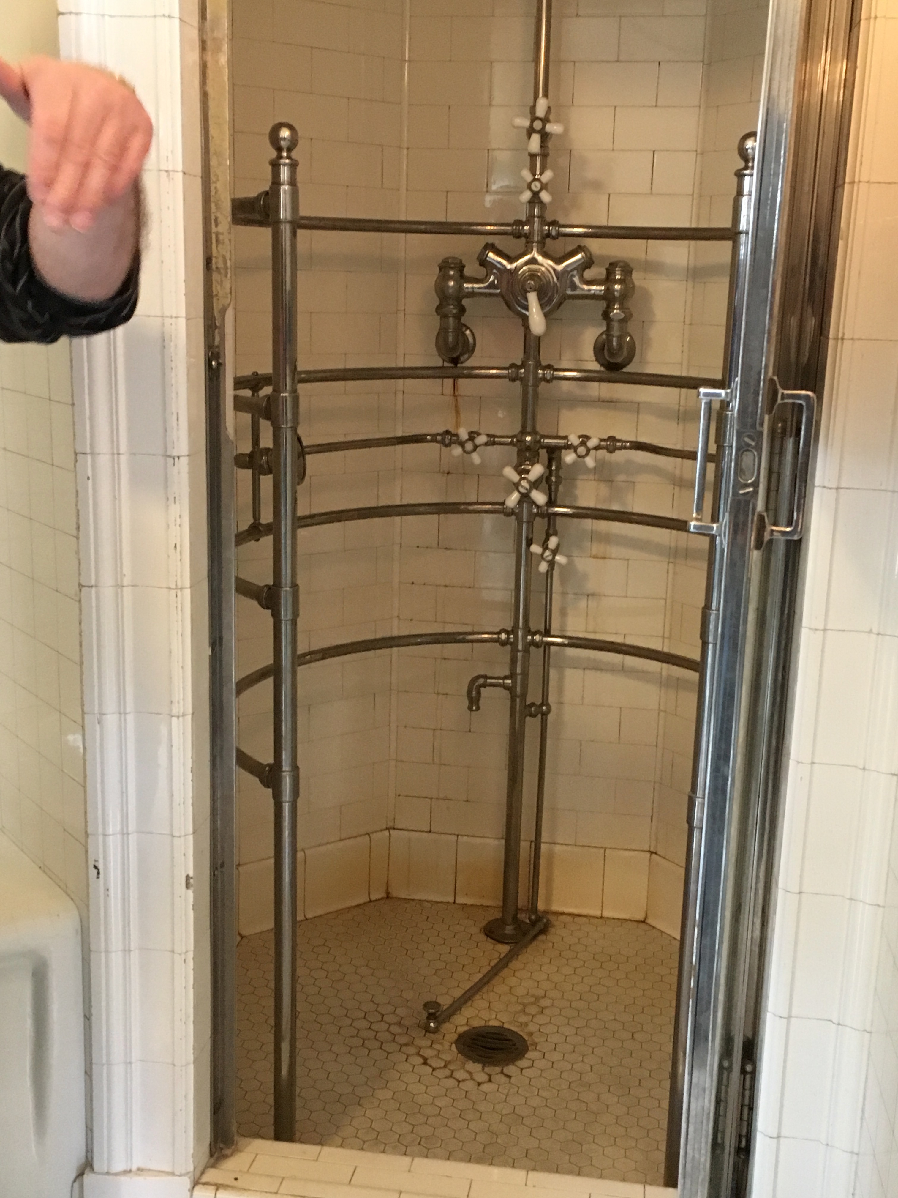 The guide who was telling us about the room, Guy, was a man of about forty, and had a personal story to tell about the room. He told us that when he was a child, his family came to visit the Mansion, which had been reopened to the public. Young Guy, his parents having wandered away, found himself alone in Mr. Pittock’s bathroom and was fascinated by the complicated brass shower. He stepped in and started flipping switches, and soon found himself being blasted with water from all sides!
