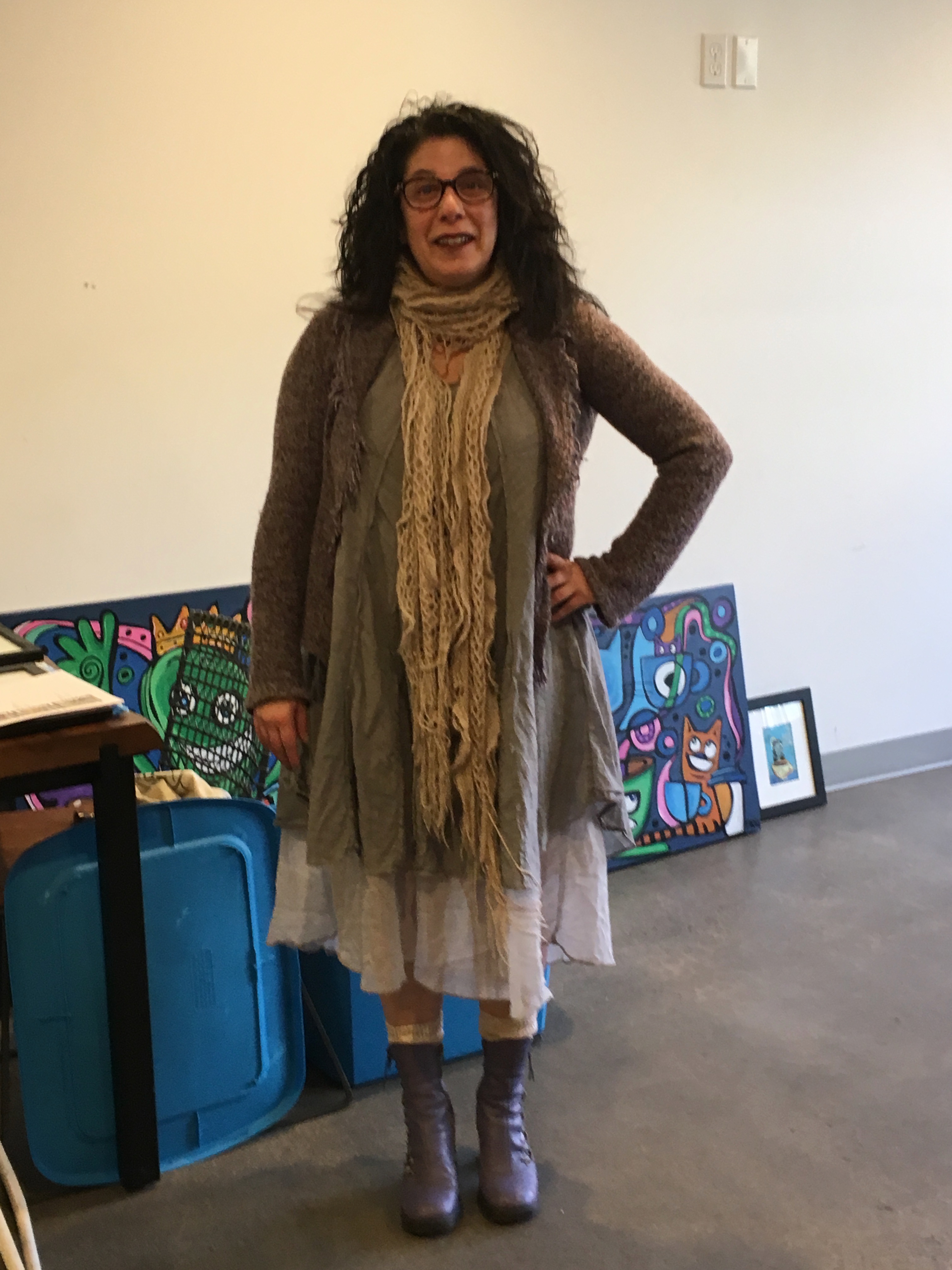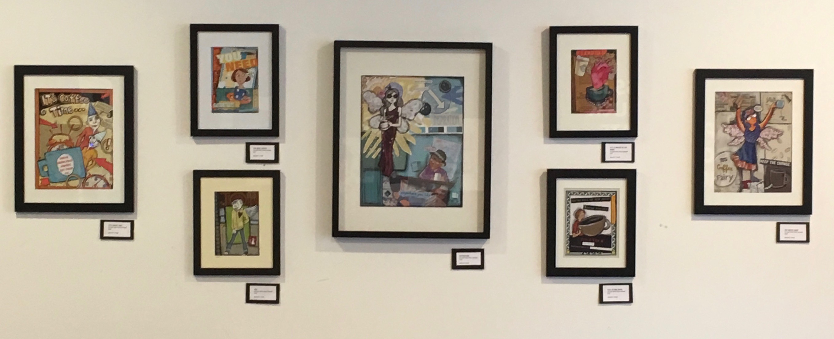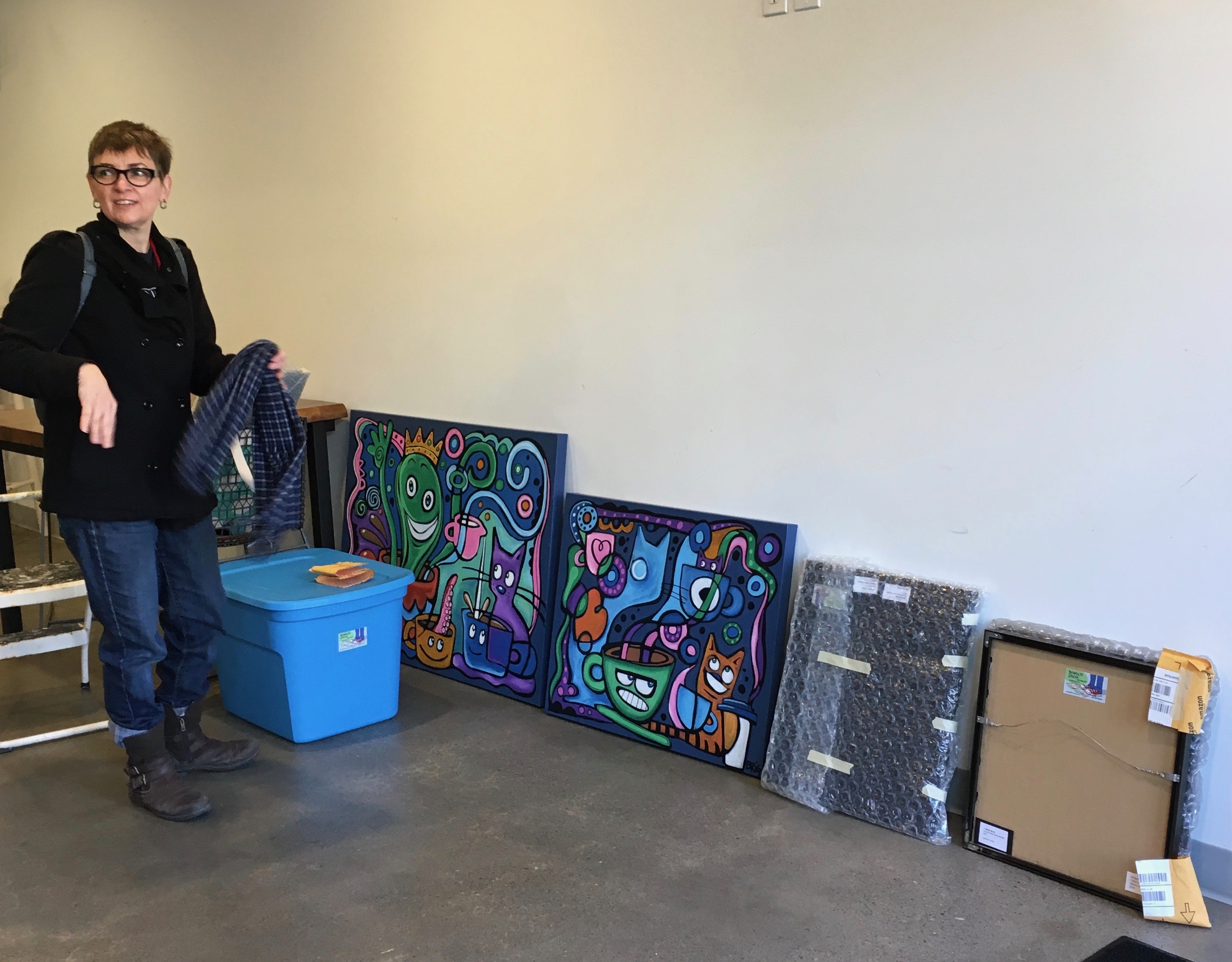 Auntie Bridgett got a lovely offer last month to display her art in Moonstruck Chocolate, a pretty candy shop in a fancy shopping neighborhood. It is on 23rd Street in the northwest part of Portland, and is nicknamed The Trendy-Third. We visited it a few weeks ago and she knew there was a lot of wall space, so she took a lot of pieces!