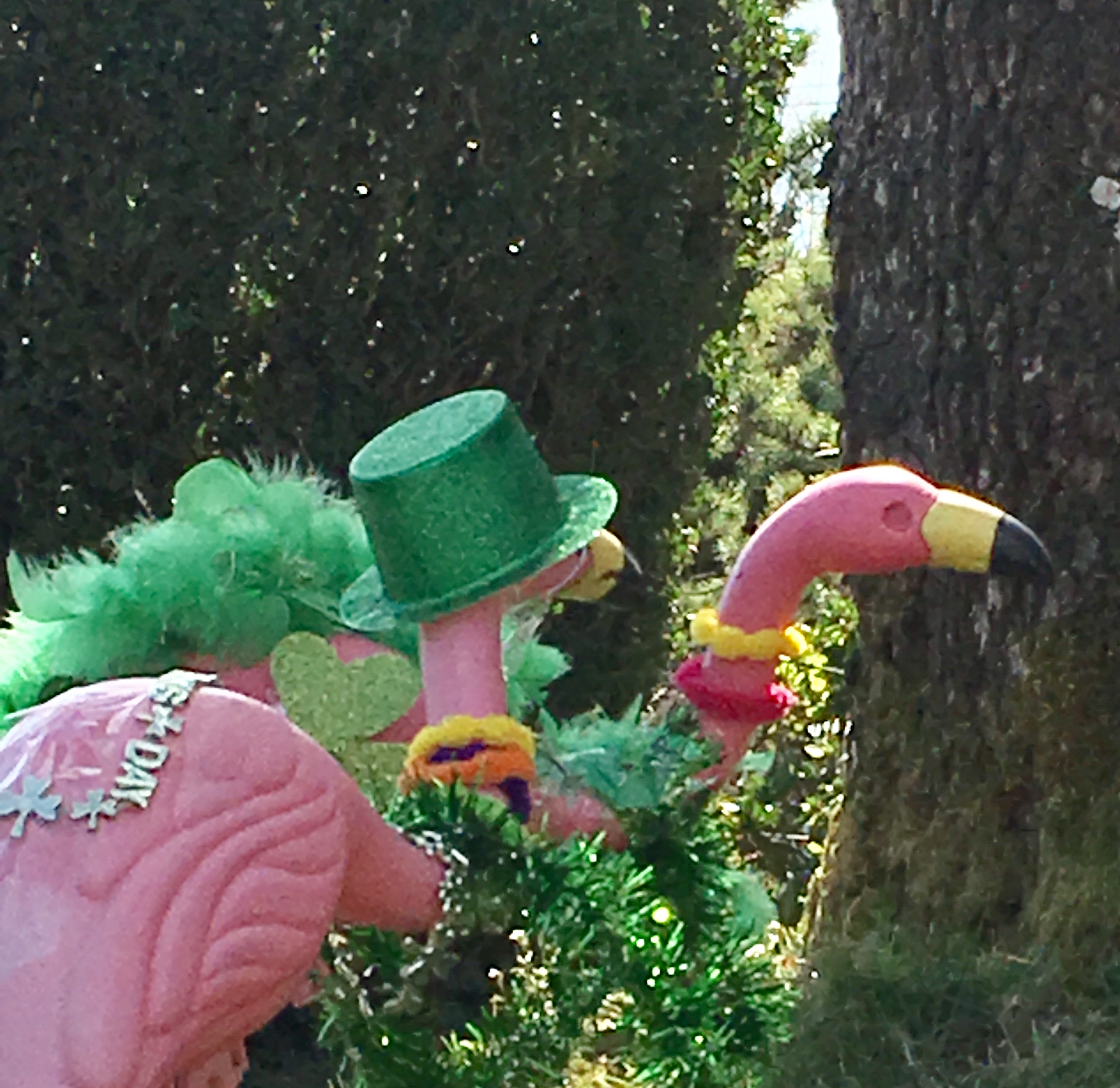 On our way through the neighborhood, we saw our old friends the flamingos! They are all dressed up for St. Patrick’s Day and seemed to be having a fine party.