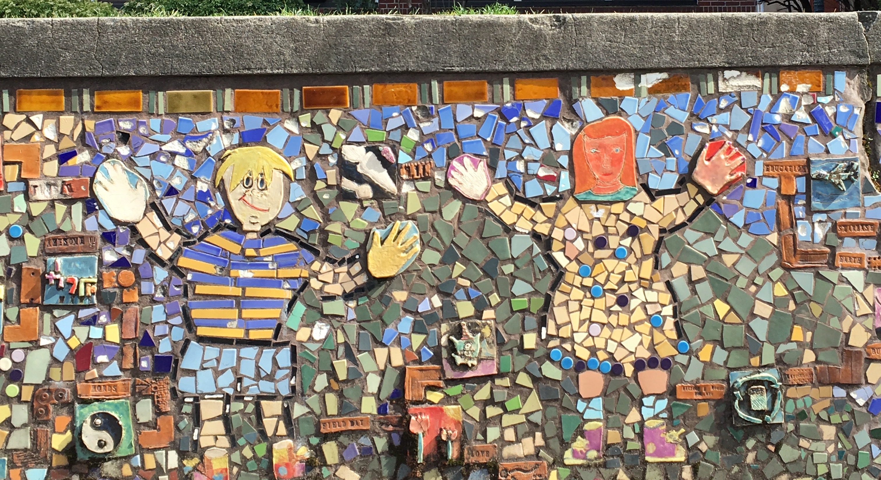 At The Buckman School (built in 1926) there is a wonderful, child made mosaic on the retaining wall out front. It is goofy and cheerful.