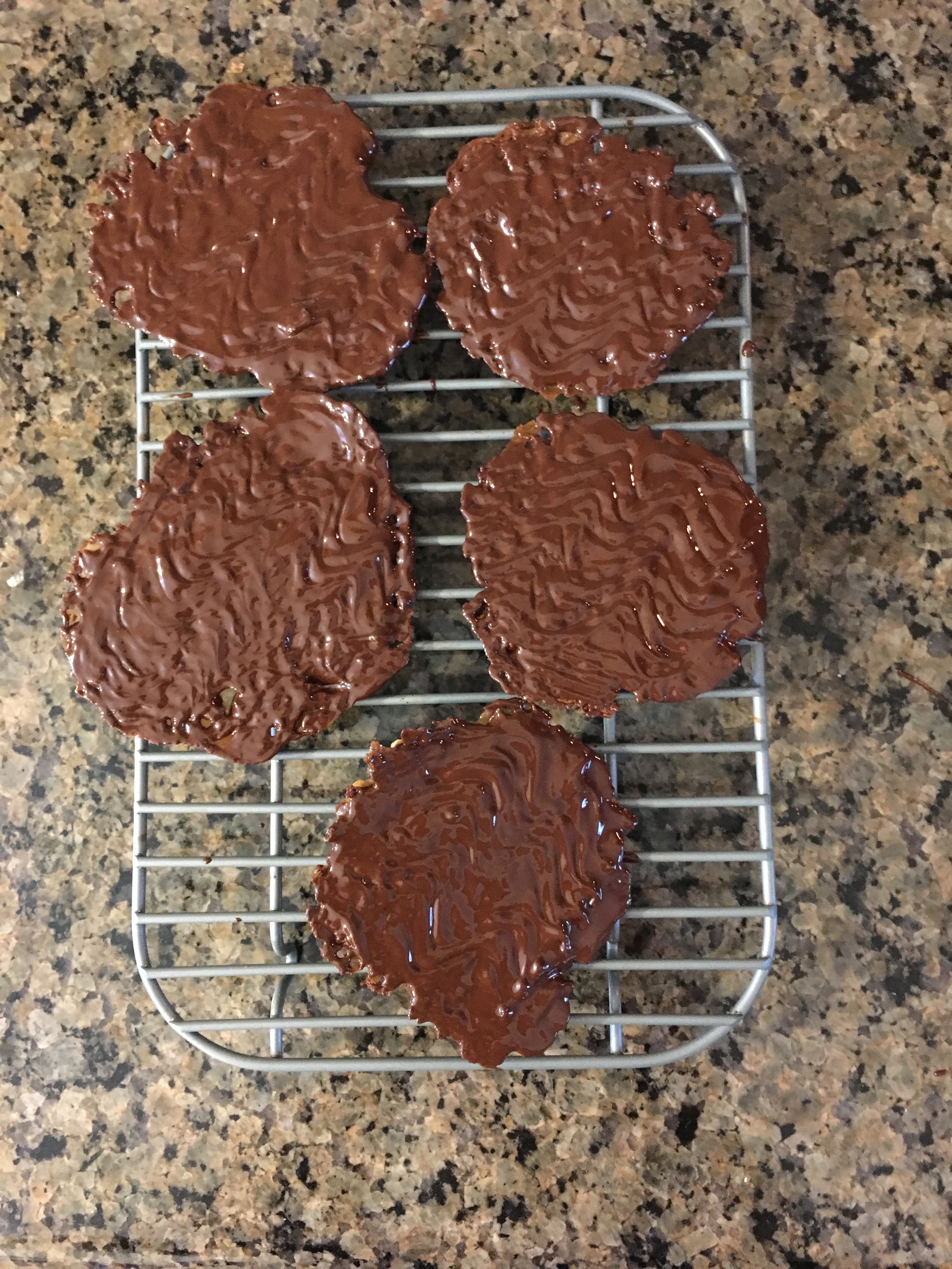 Using my new scale carefully, following directions, and having all my ingredients and tools out and ready beforehand allowed me to make a half-recipe of these wonderful cookies. The ingredients are few and basic: Butter, Sugar, Golden Syrup, flour, and nuts. I painted melted chocolate on half of the small batch, and was able to make the traditional zigzig pattern. But I prefer them without the chocolate, which I think masks the delicate, nutty caramel flavor.