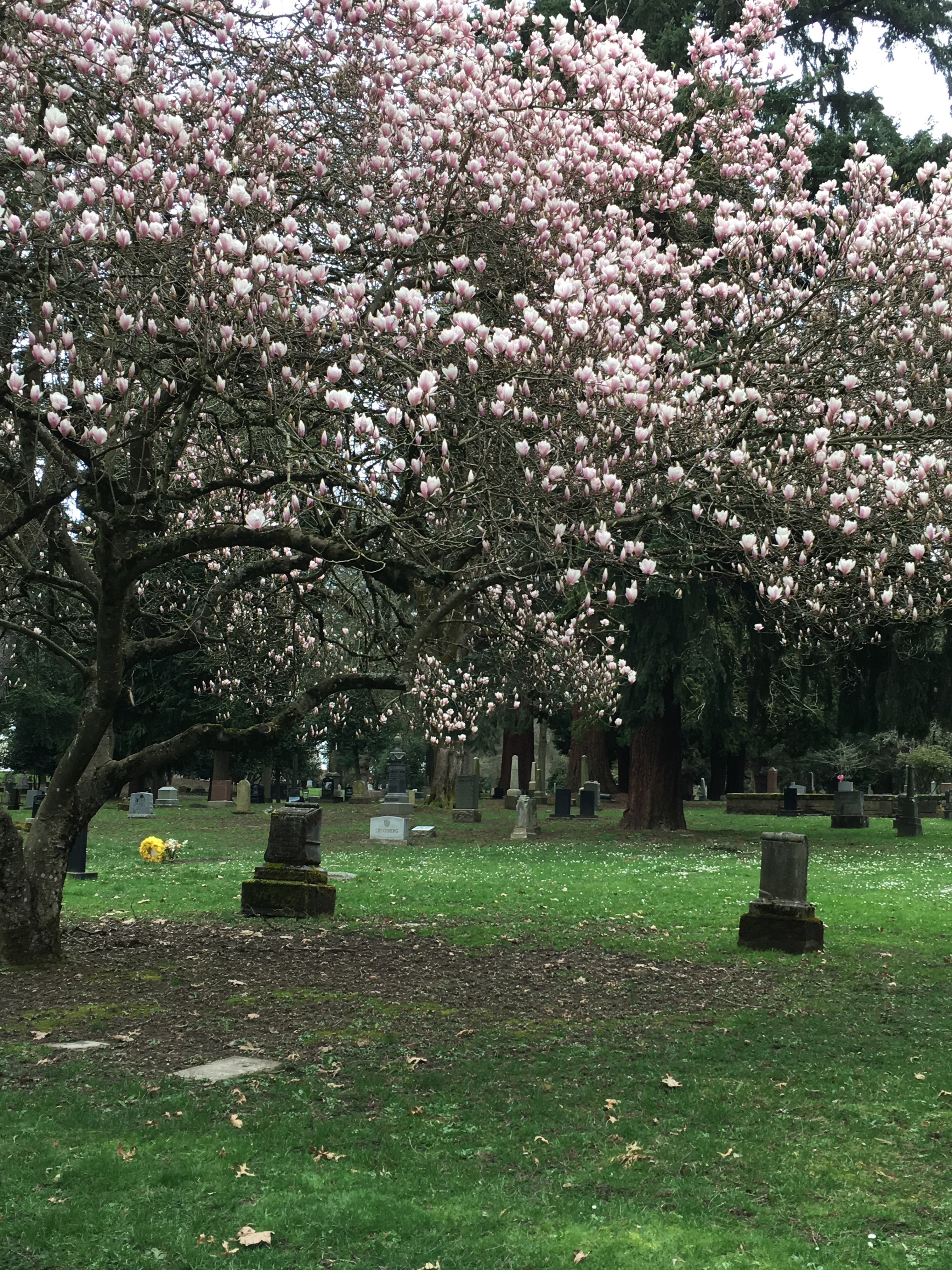 Auntie Bridgett and I walked to the Lone Fir Cemetery the other day. It was the first time I’ve been there since the spring colors have arrived.