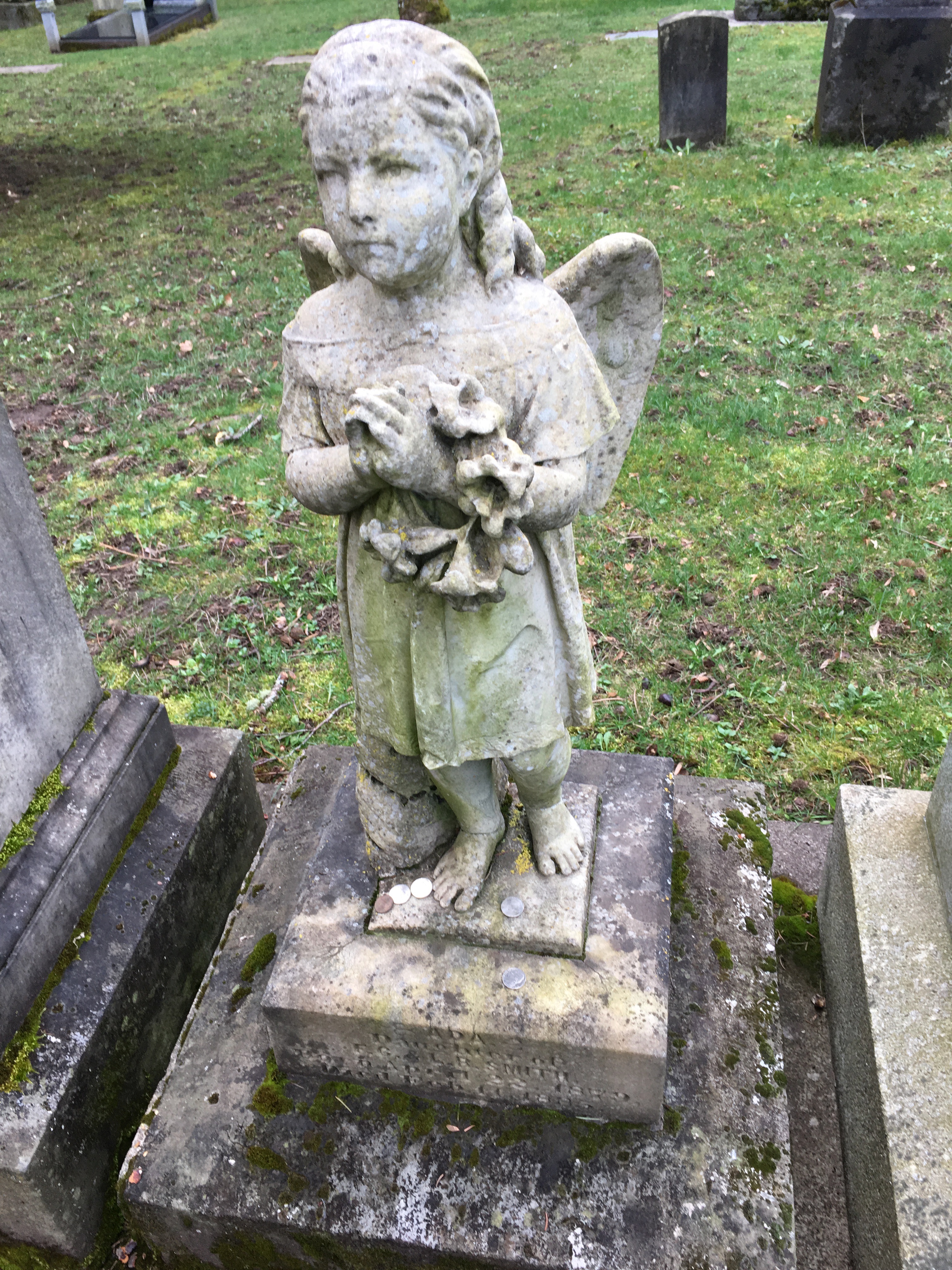 Near the tall monument to Dr. Hawthorne, we found this lovely statue on the grave of a little girl who passed away when she was only six. Her name was Ada Smith, daughter of Frederick and Lucinda. People have left her change, for some reason. Perhaps these caring folks thought she might like ice cream money.