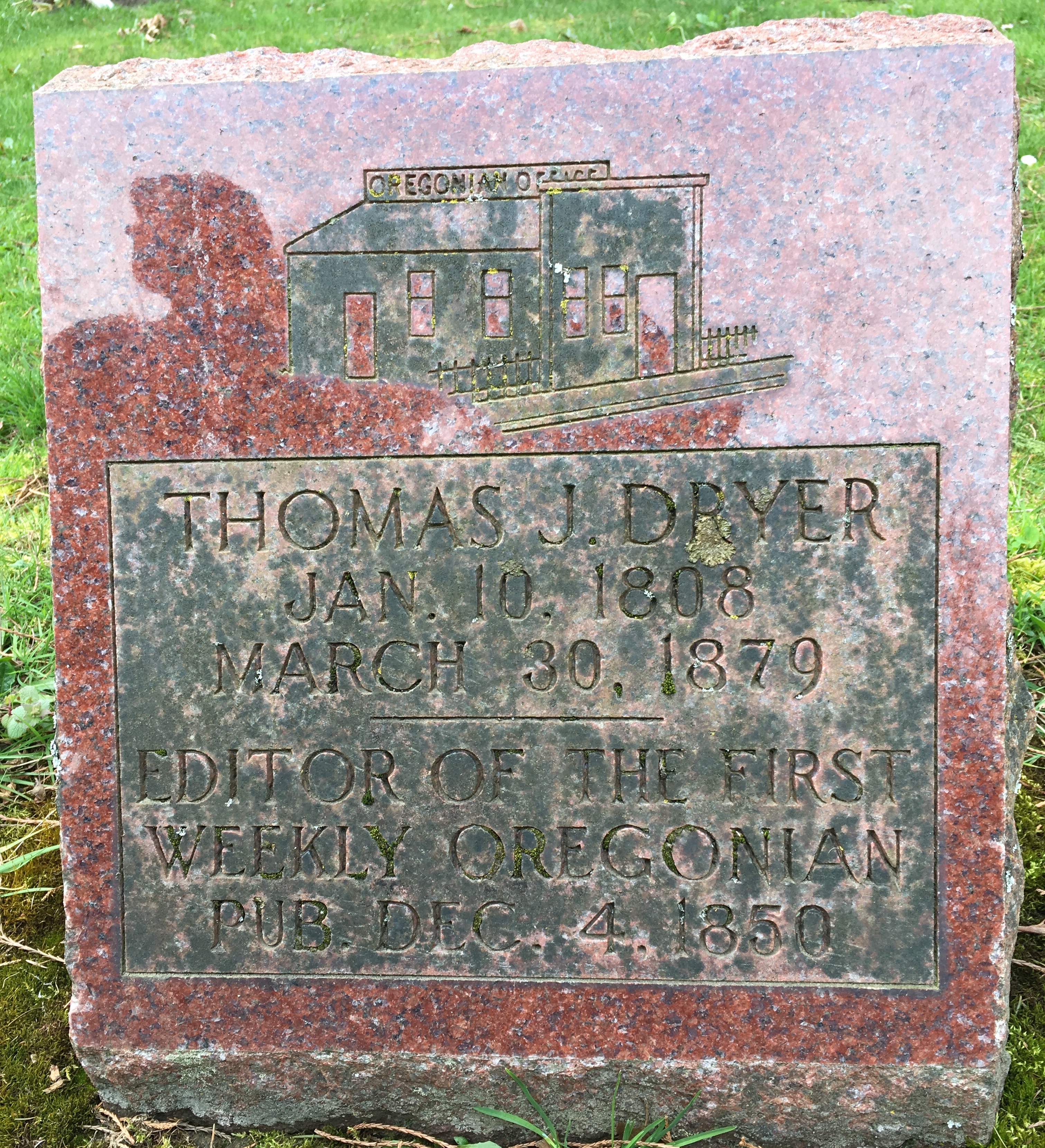 Finally, just where the map said, we found Mr. Dryer. He came to Portland in 1850 and started the “Oregonian” as a weekly paper. He was not a very good businessman, however, and was unable to pay his printer, a young man named Henry Pittock, for months at a time. Dryer eventually gave ownership to Mr. Pittock, who turned it into a daily paper and became of of the richest men in town. Mr. Dryer stayed active in politics and the well-being of the city until he died.
