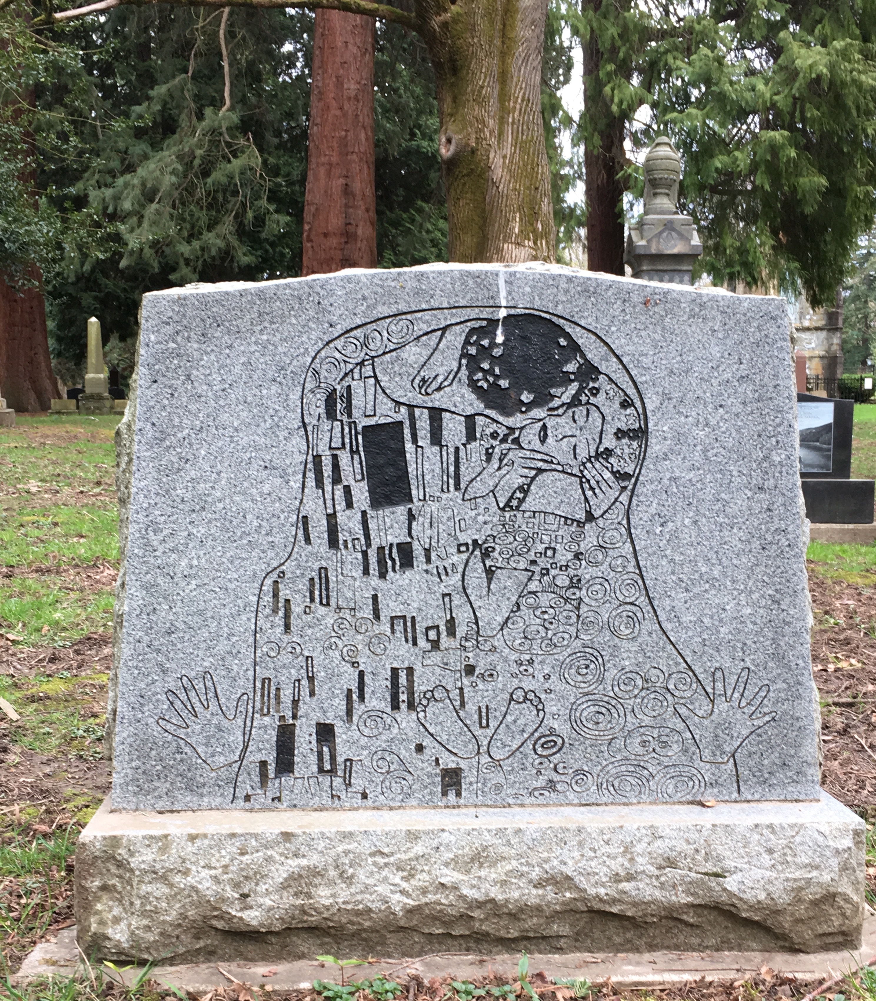 Wandering around, we found the headstone for Hope and Chris Carter, decorated with a likeness of Klimt’s “The Kiss”. Hope is buried here, having passed at age 32, awaiting her beloved.