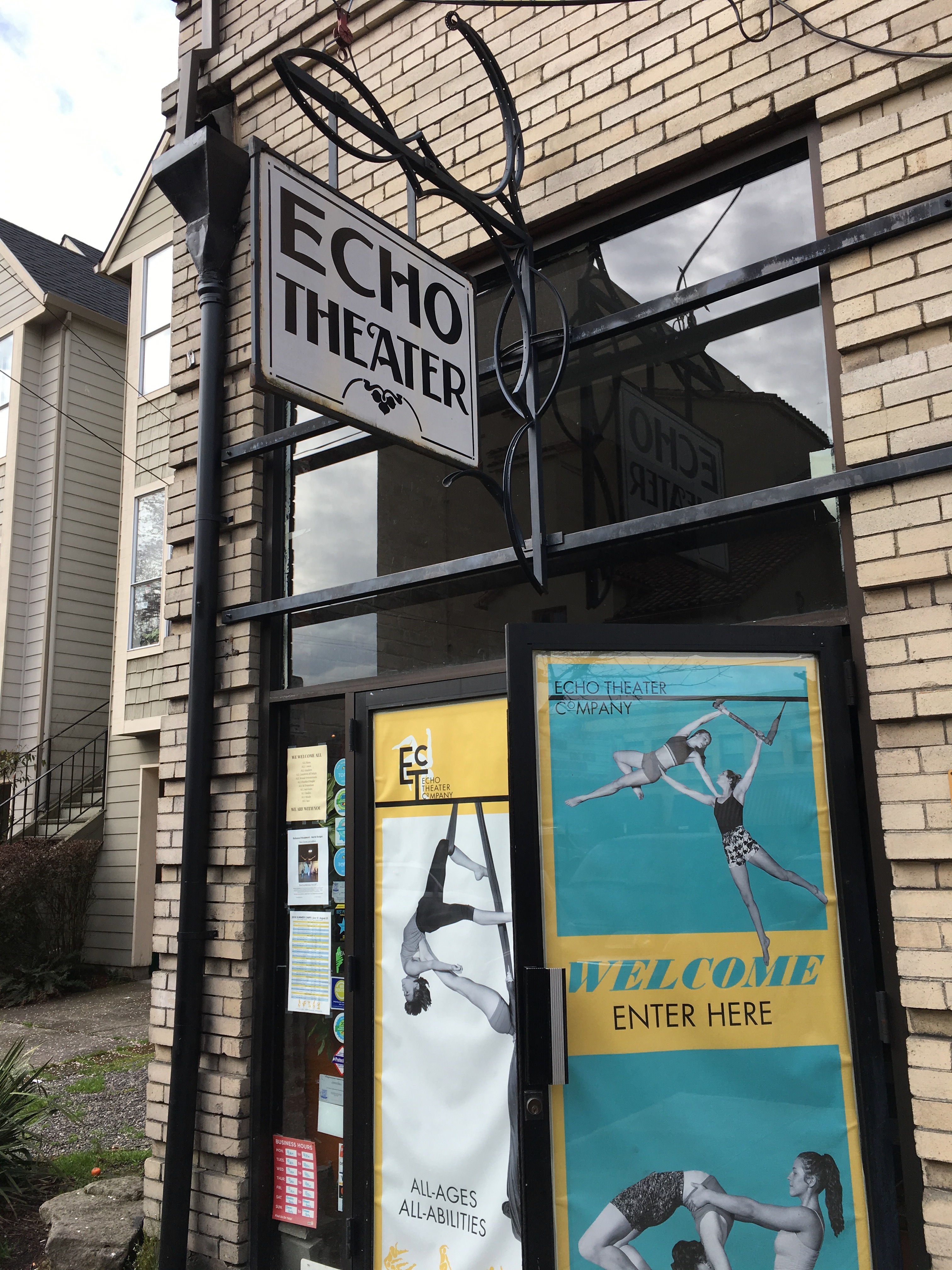 This camp was different from the Cascadia Circus camp they have been attending. It is held inside, at the old Echo Theater on SE 37th Street. Originally built in 1910 as a silent movie house, the Echo became a live music venue and dance hall when talkies arrived across the street at the Bagdad Theater. Its wide open inside space is hung with trapezes and covered with tumbling mats, with a few bleachers for us folks to watch everyone’s progress.
