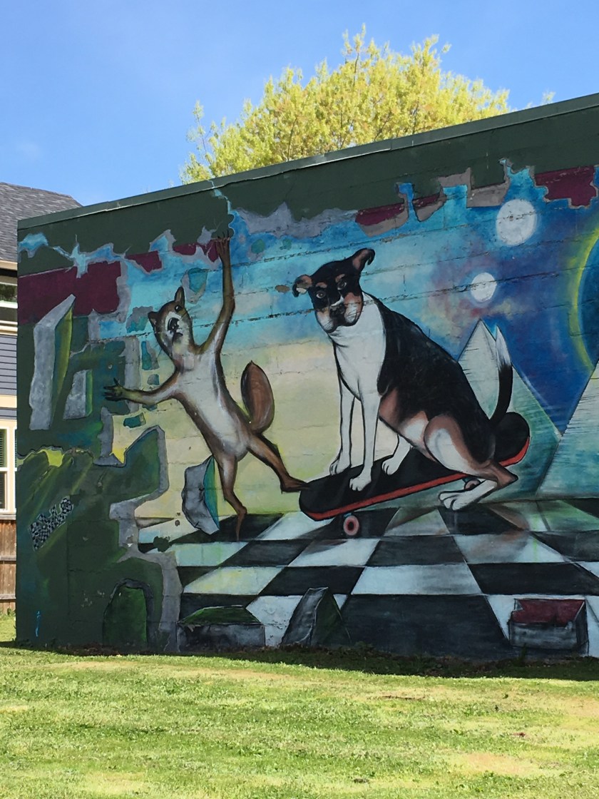 More art that we saw was this not-very- flattering, but very amusing, portrait of Mr. Trump, and this mural of a squirrel and his dog friend skateboarding.