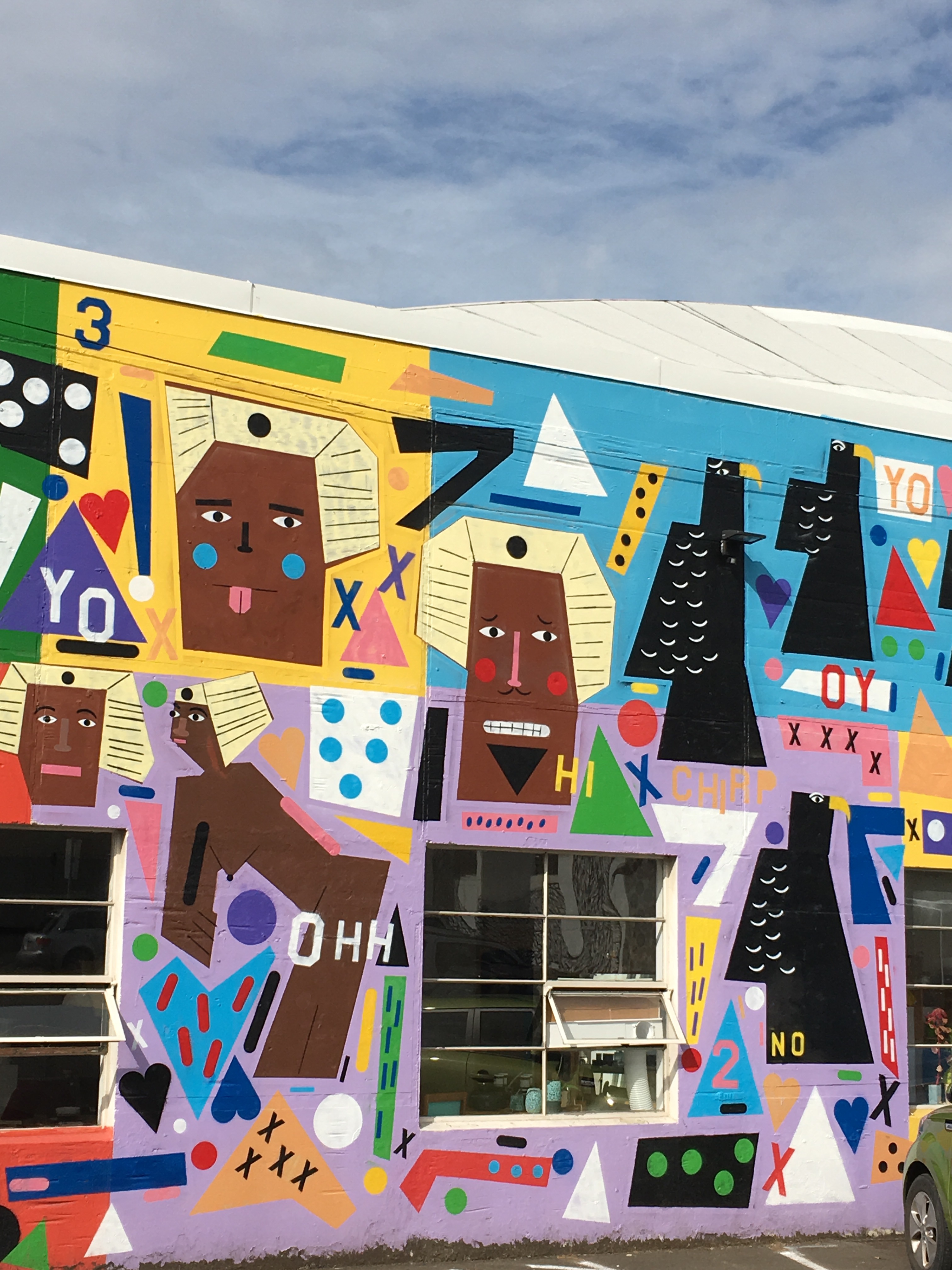 We particularly liked these little guys, with their positive messages and simple, cartoony lines. Auntie Bridgett, in her learning about Portland artists, learned that they are painted by a man named Gary Hirsch.