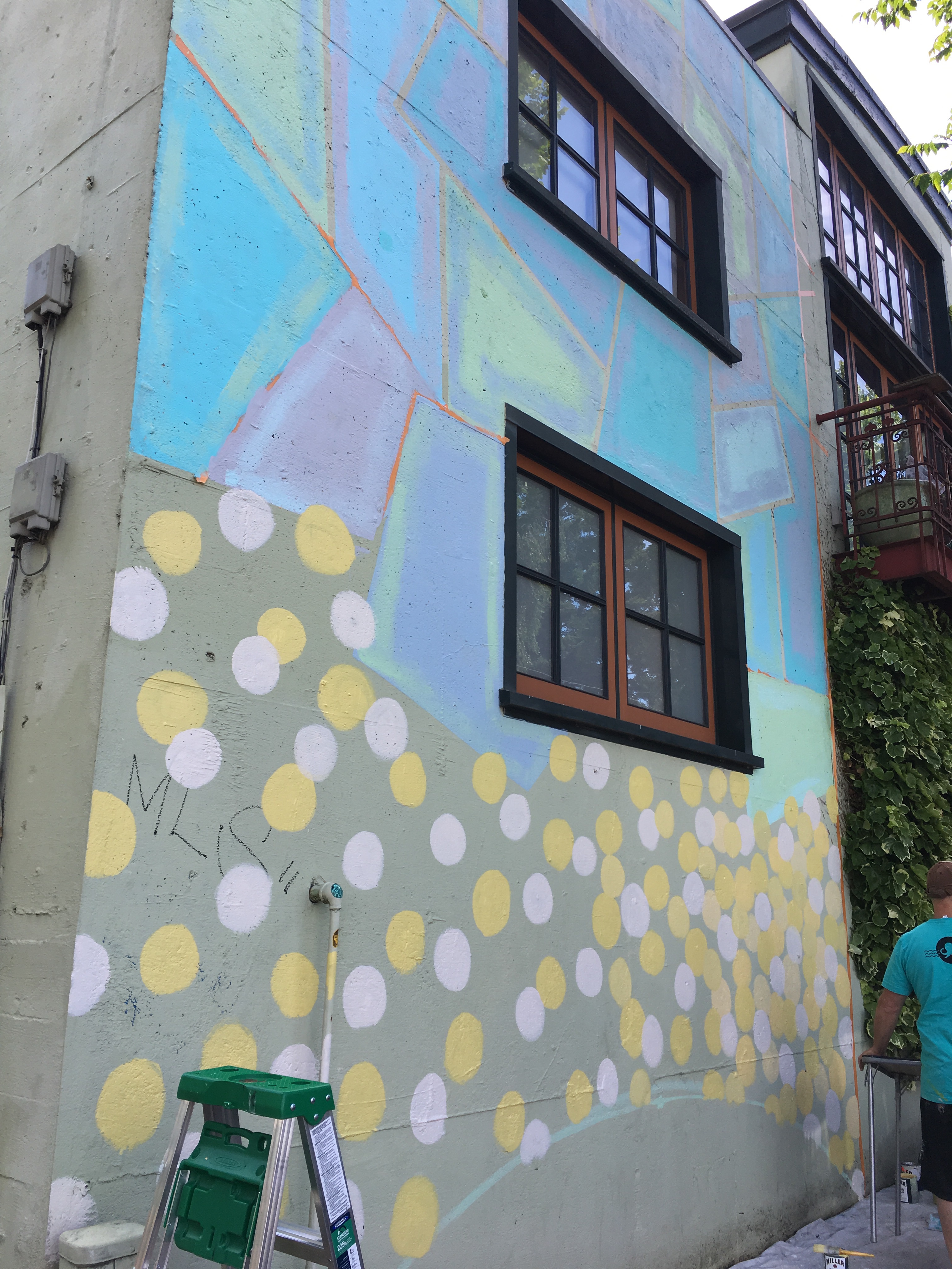 It turns out that Gary, who lives here in Portland, enjoys painting his happy characters, called Botjoys, so much that he doesn’t charge for his art! He charges for paint, asks for a little help adjusting the equipment, and then makes the wall better.