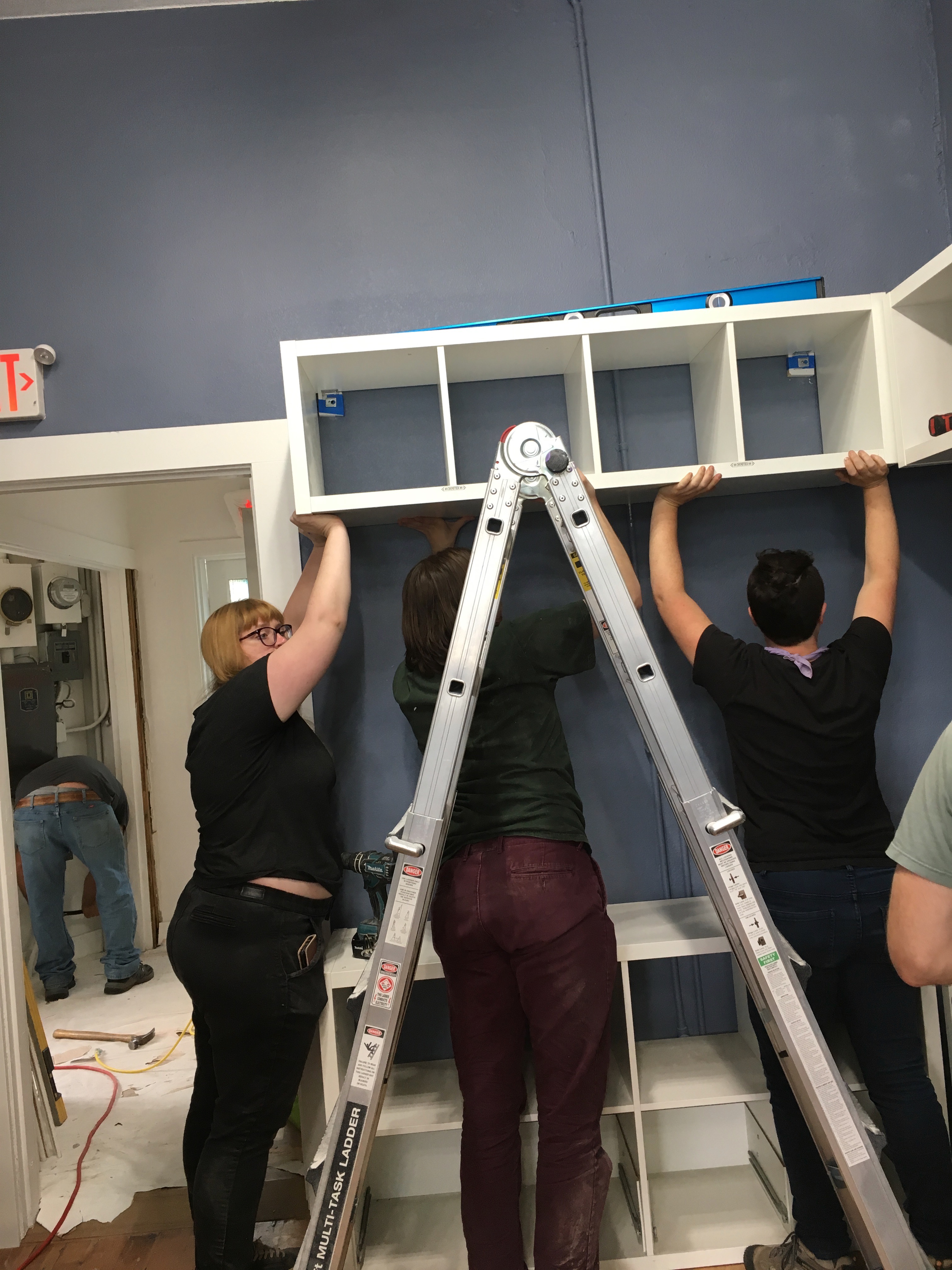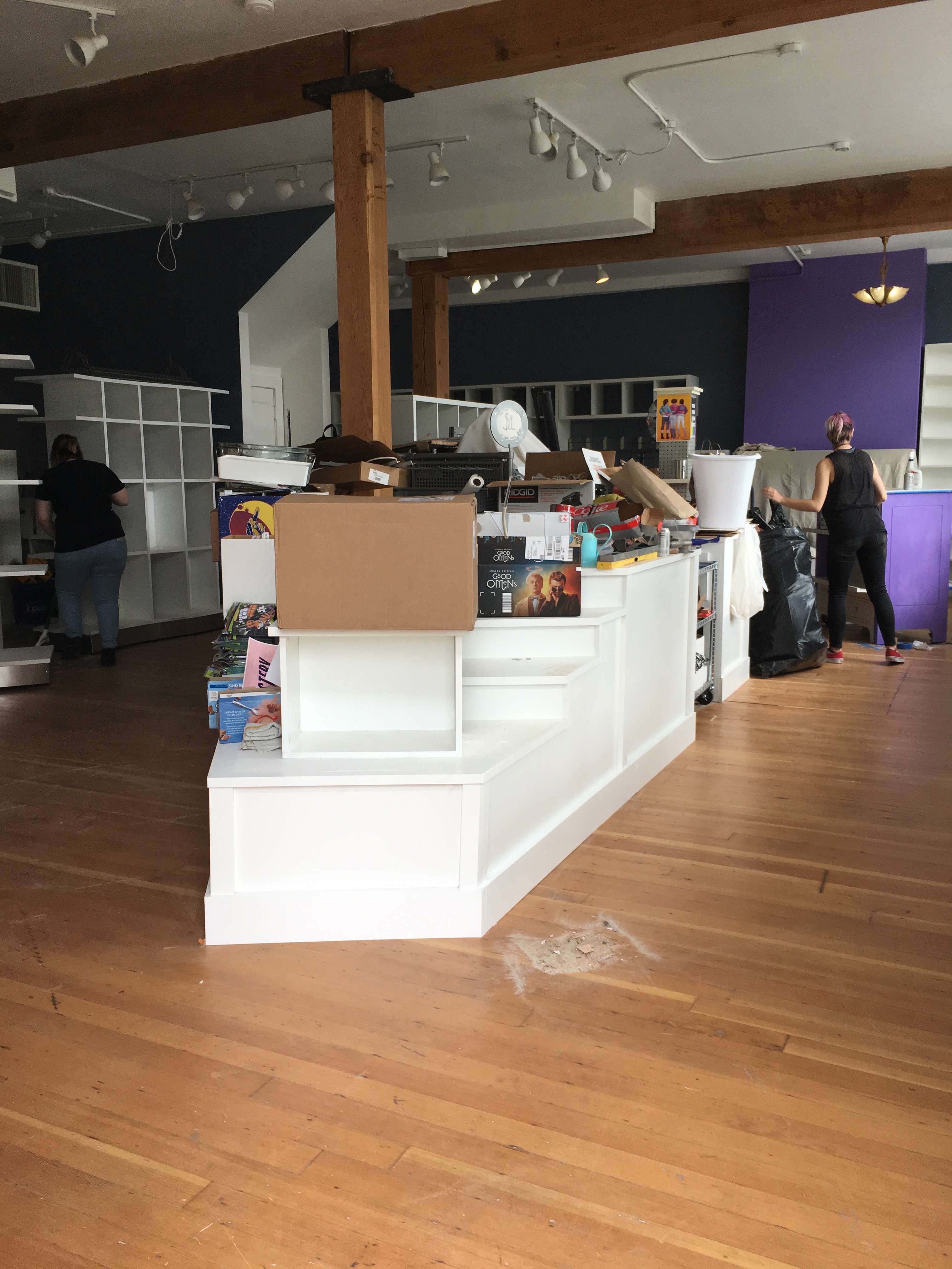 And while she was gone, the work continued. Orchestrated by artist and bookshop minion Nick Orr, we lifted and secured shelving, repaired and painted bookcases, and swept up pounds of dust and debris. It was exhausting and amazing.