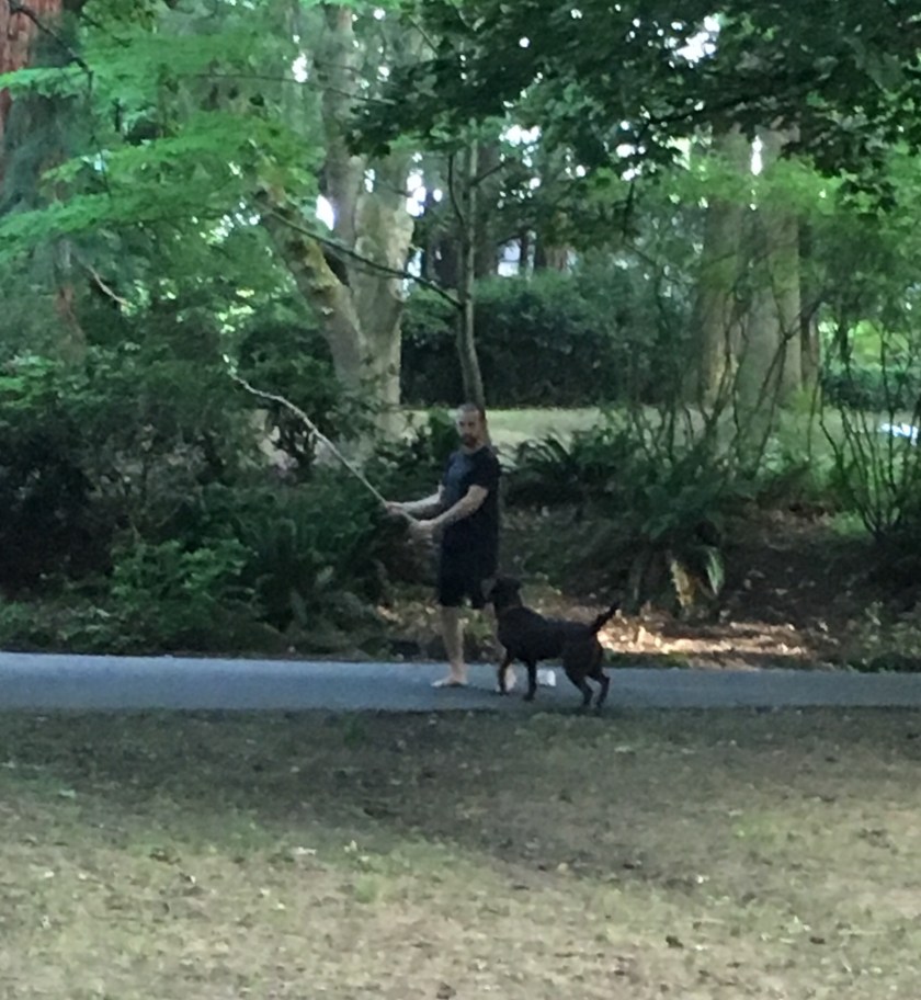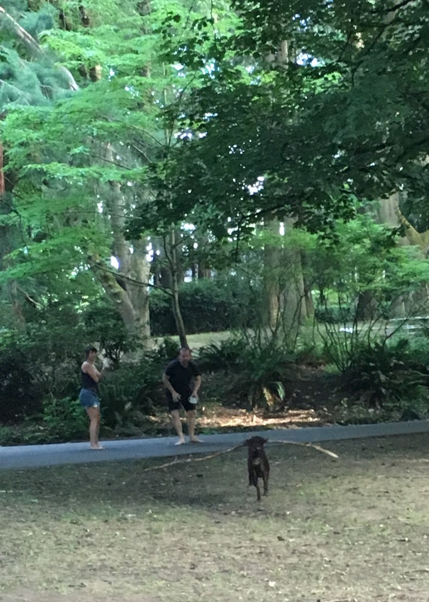 This wonderful Labrador and his people were walking along the path in the Valley. This area is flooded in winter, but in summer it becomes the Off Leash area to let the other one green up. The people carried coffee mugs. The Lab carried a giant stick.