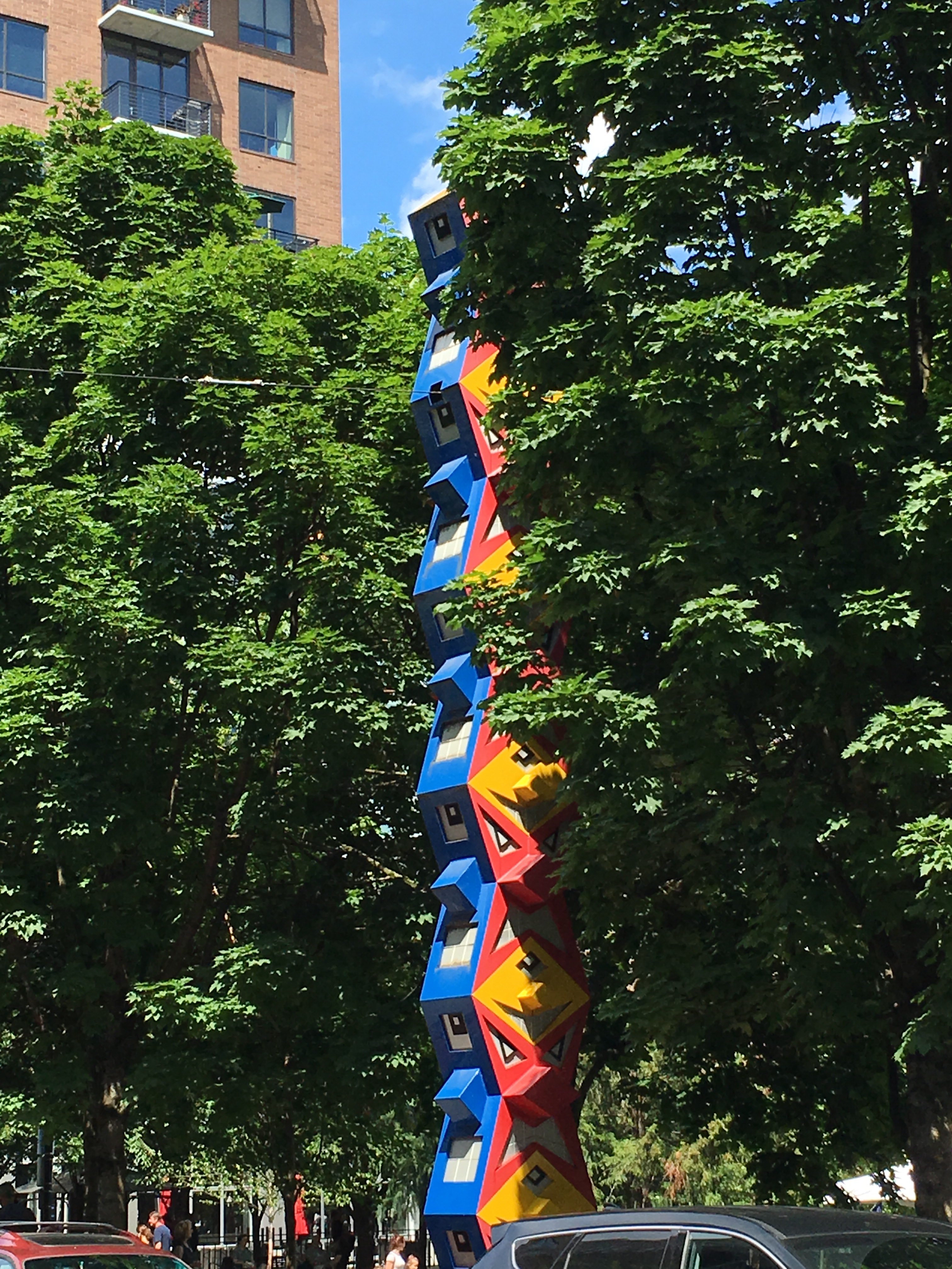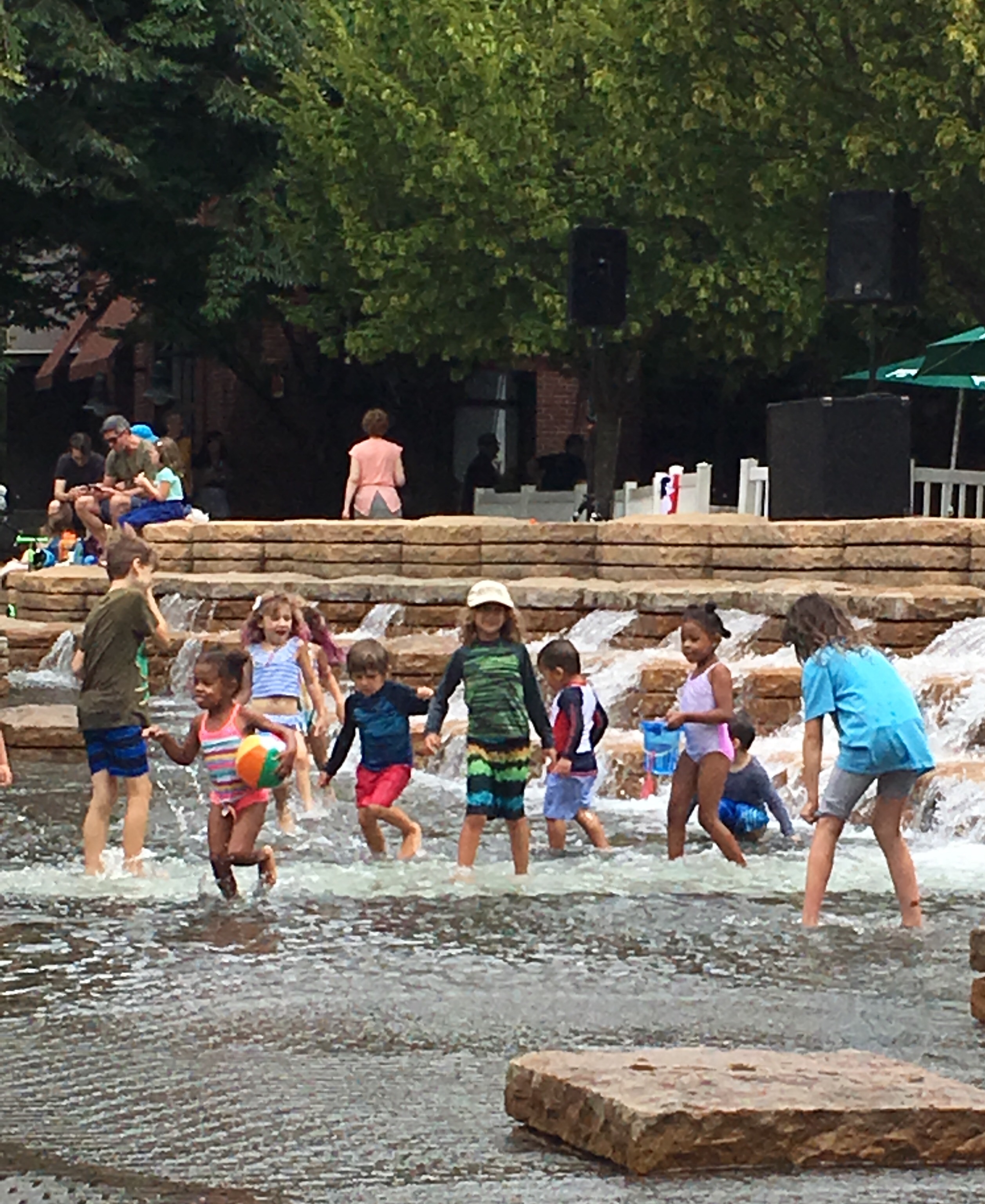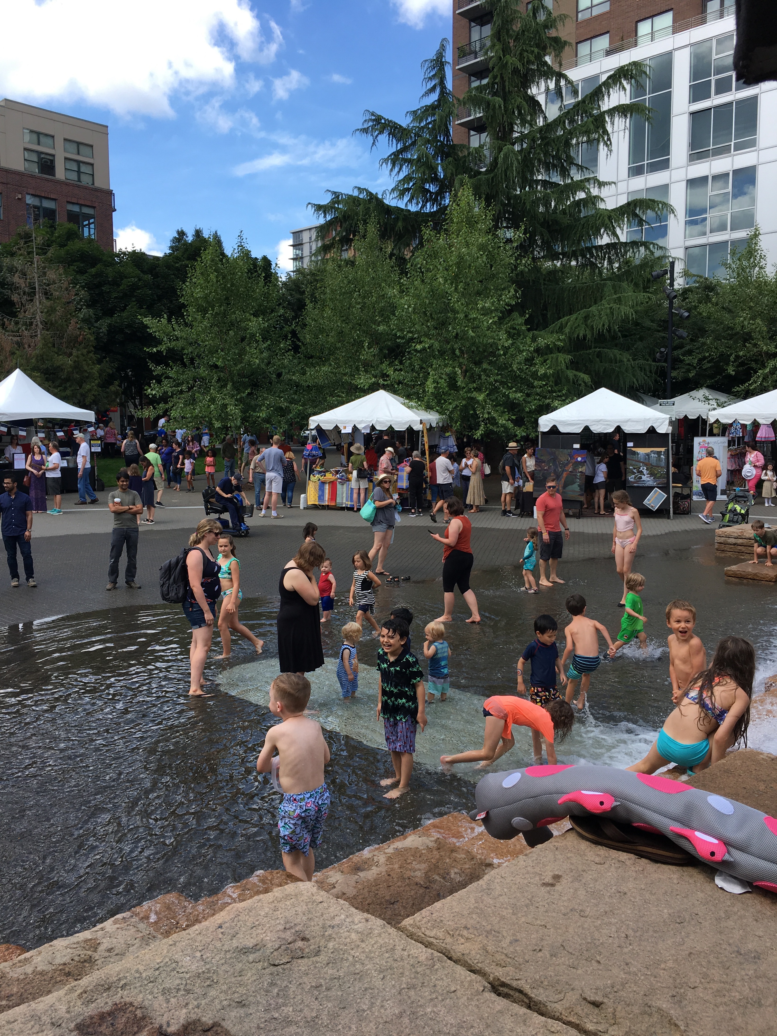 Jamison Square has a wonderful fountain for kids to play in. It is an “urban tide pool”, where water rushes over rough cut blocks and fills a shallow wading pool, making a great place for kids to play and grown ups to cool off. On a hot day like Saturday, it was very popular.