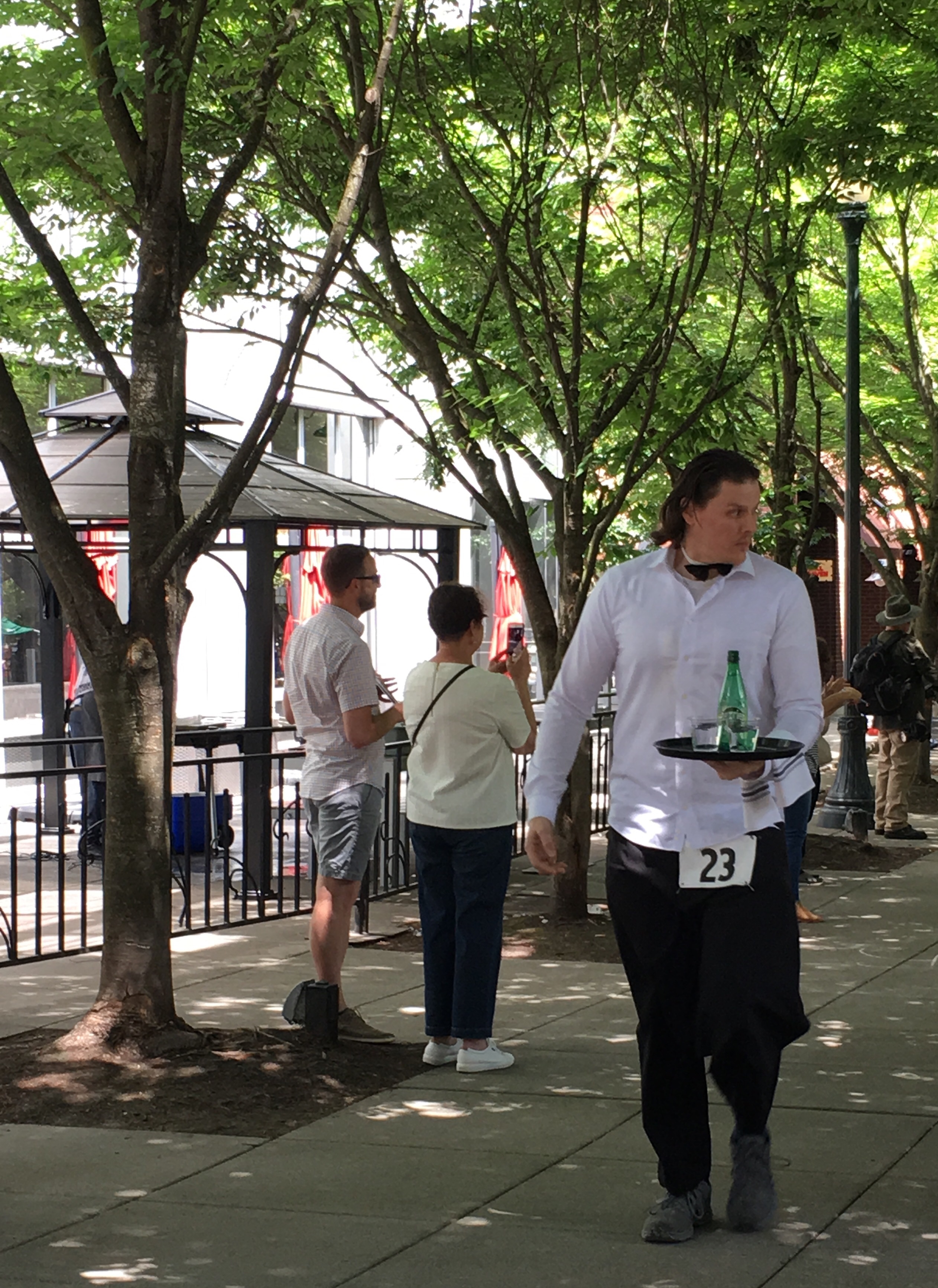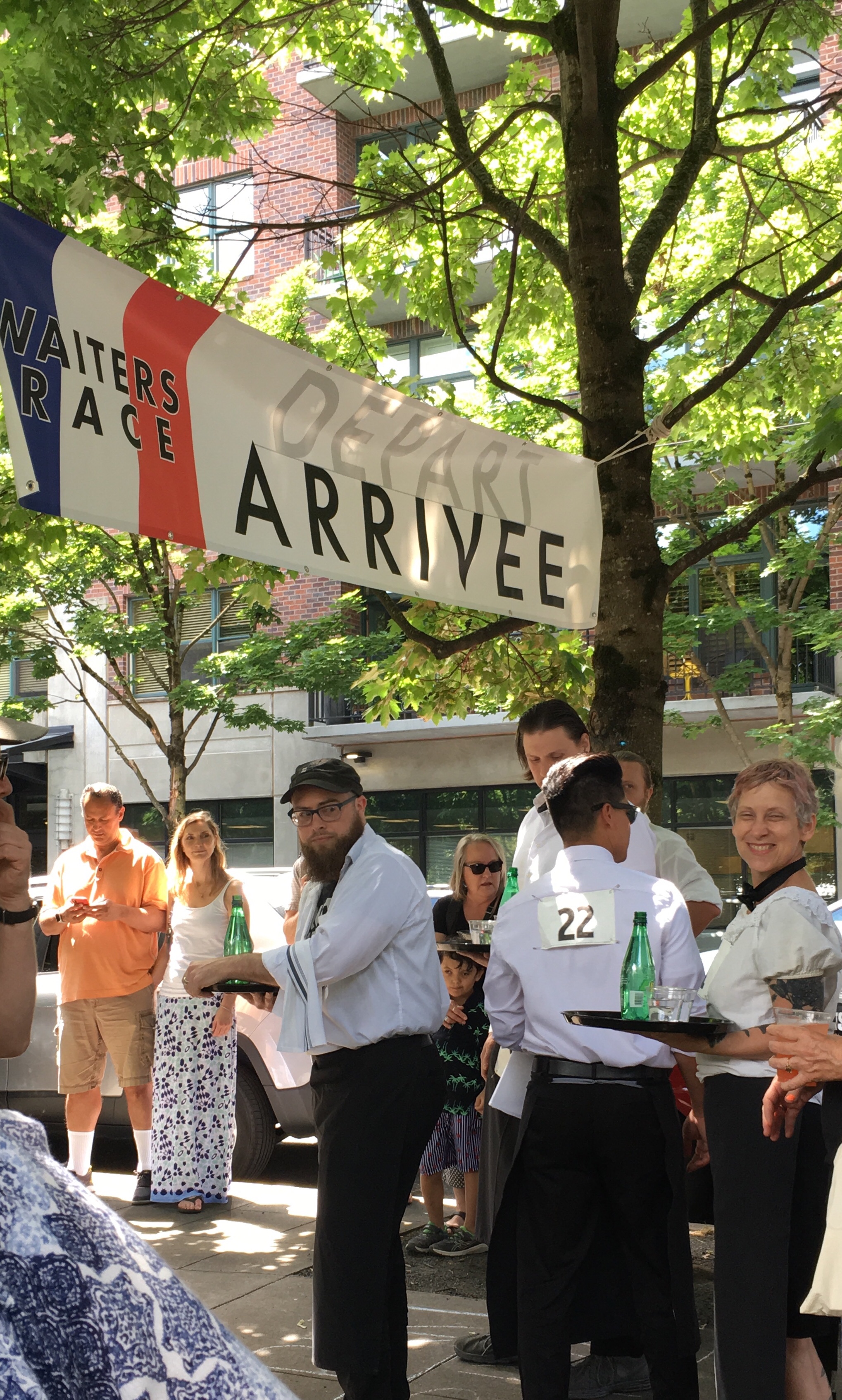 But the highlight of the day was The Waiters’ Race ( Le Cours des Serveurs). Five men and four women, dressed in wait staff’s standard black and white uniform with a white towel over their left arm, each carried a tray with a bottle of Perrier and two full glasses, three times around the Square.