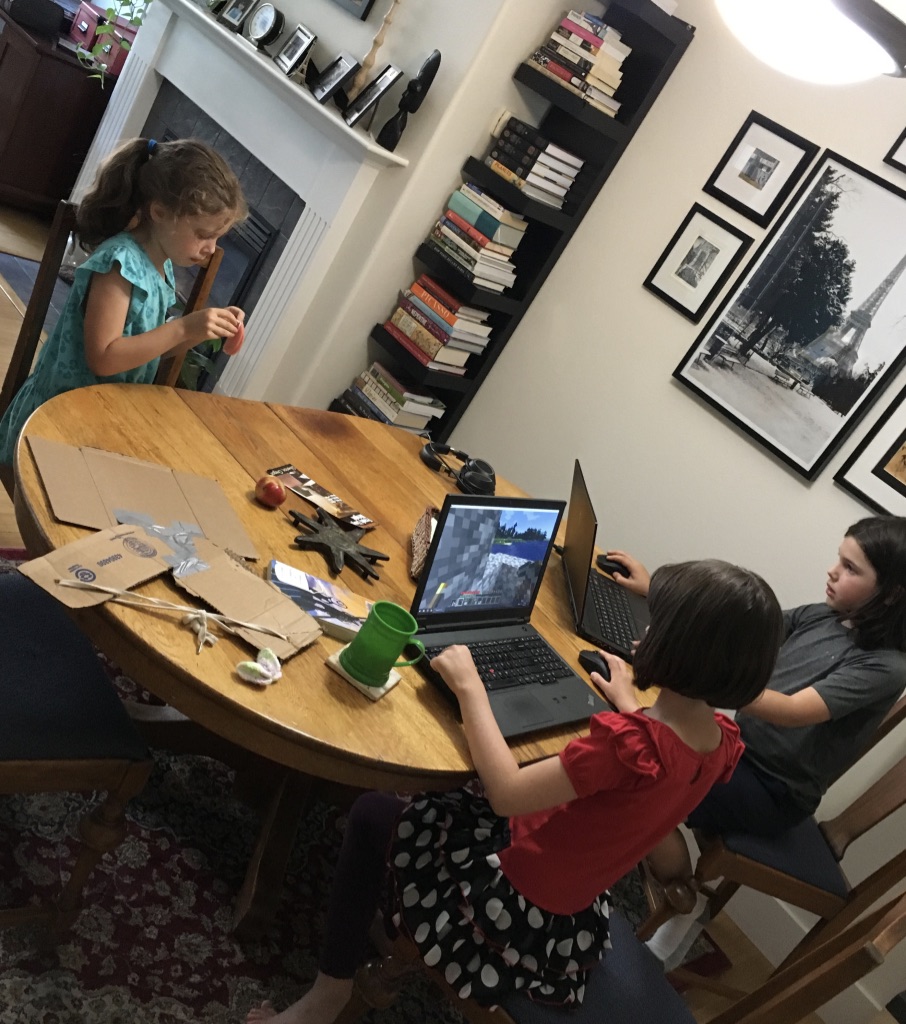 Uncle Nelson and I drove across town to fetch Cousins Jasper and Kestrel from Trackers camp, and all the kids got to play. Jasper and Liza both love Minecraft, so they built houses, grew sugar cane, and fought fire zombies. They really hate fire zombies.