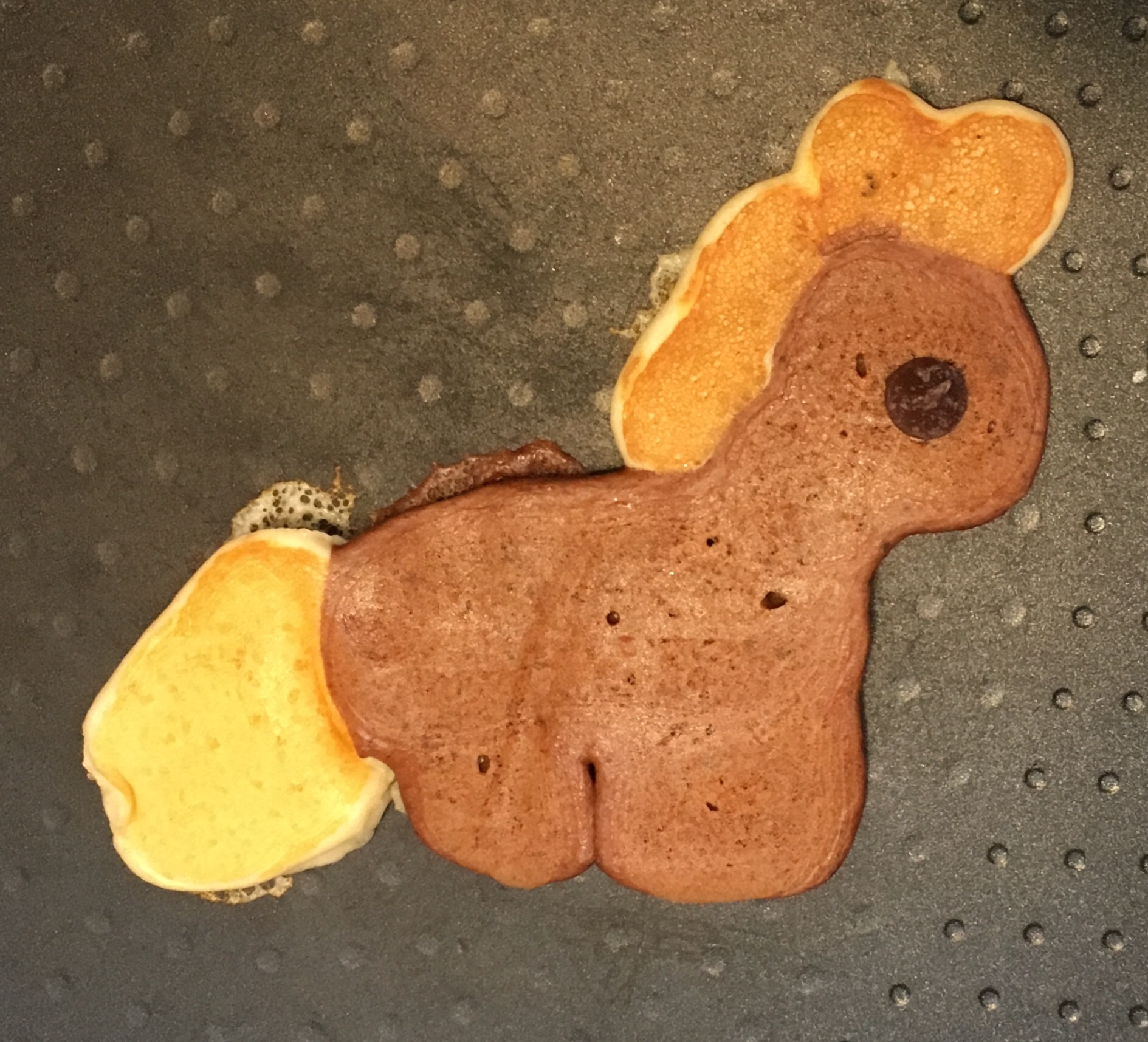 We made spirals, circles, and even a My Little Pancake, which we thought would be a good cartoon series, about pancake ponies that go on adventures…and then get eaten.