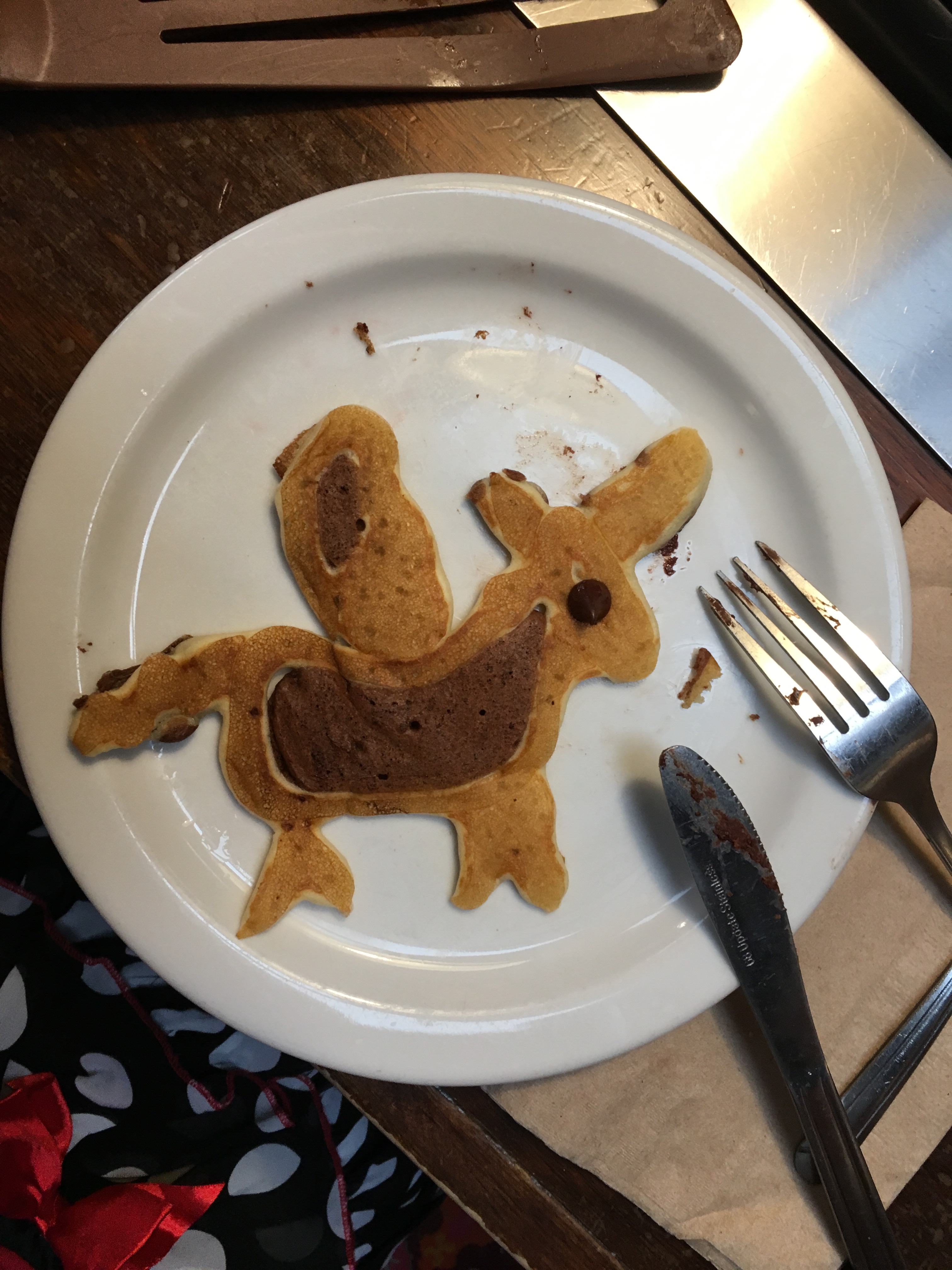 We got there just after Slappycakes opened, so we didn’t have to wait for a table, and we got to relax and play with our food. We all got very creative. Liza made a heart and happy face. She also added a wing into the unicorn I made her to create an Alicorn, which is her favorite animal.