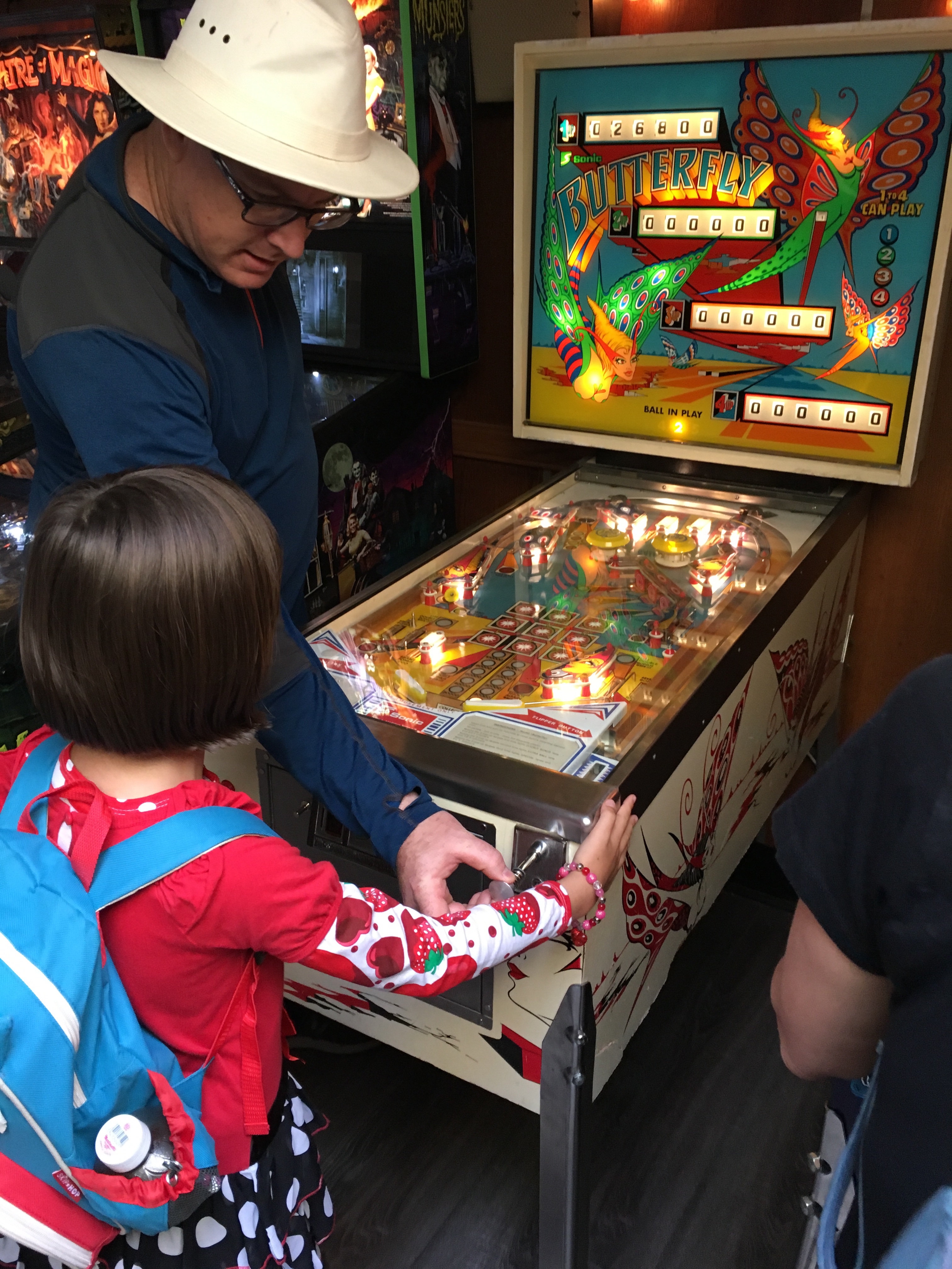 After some rest and art time with Auntie Bridgett, we all walked to Blackbird pizza for lunch. Liza got to play her first game of pinball. It went by so fast! But she got to hit the ball quite a few times before it escaped down the hole.