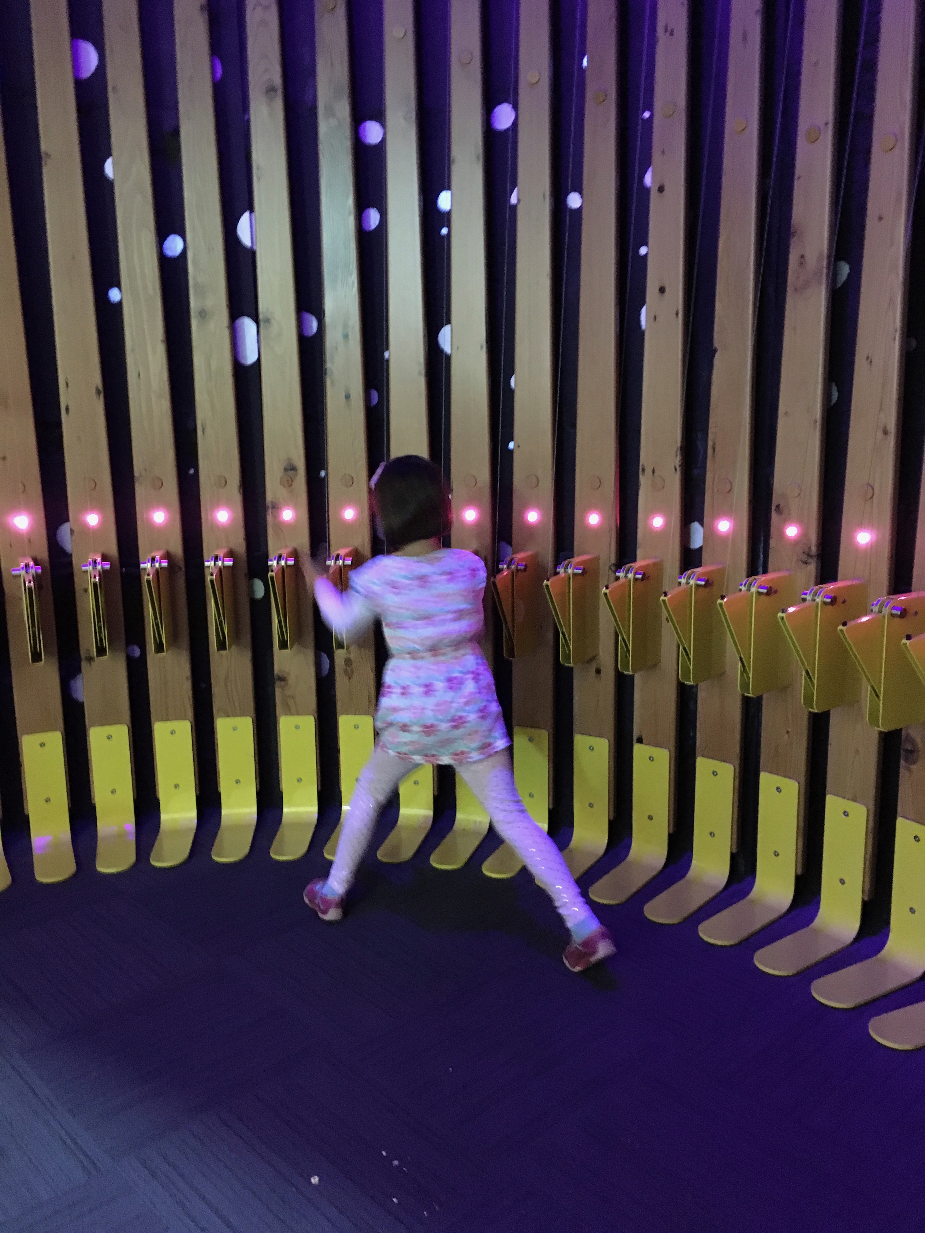 There is a big harp-like creation that our neighbor Jonathon helped design which Liza loved playing! The activity is part dance, part music, part light show. It was wonderful!