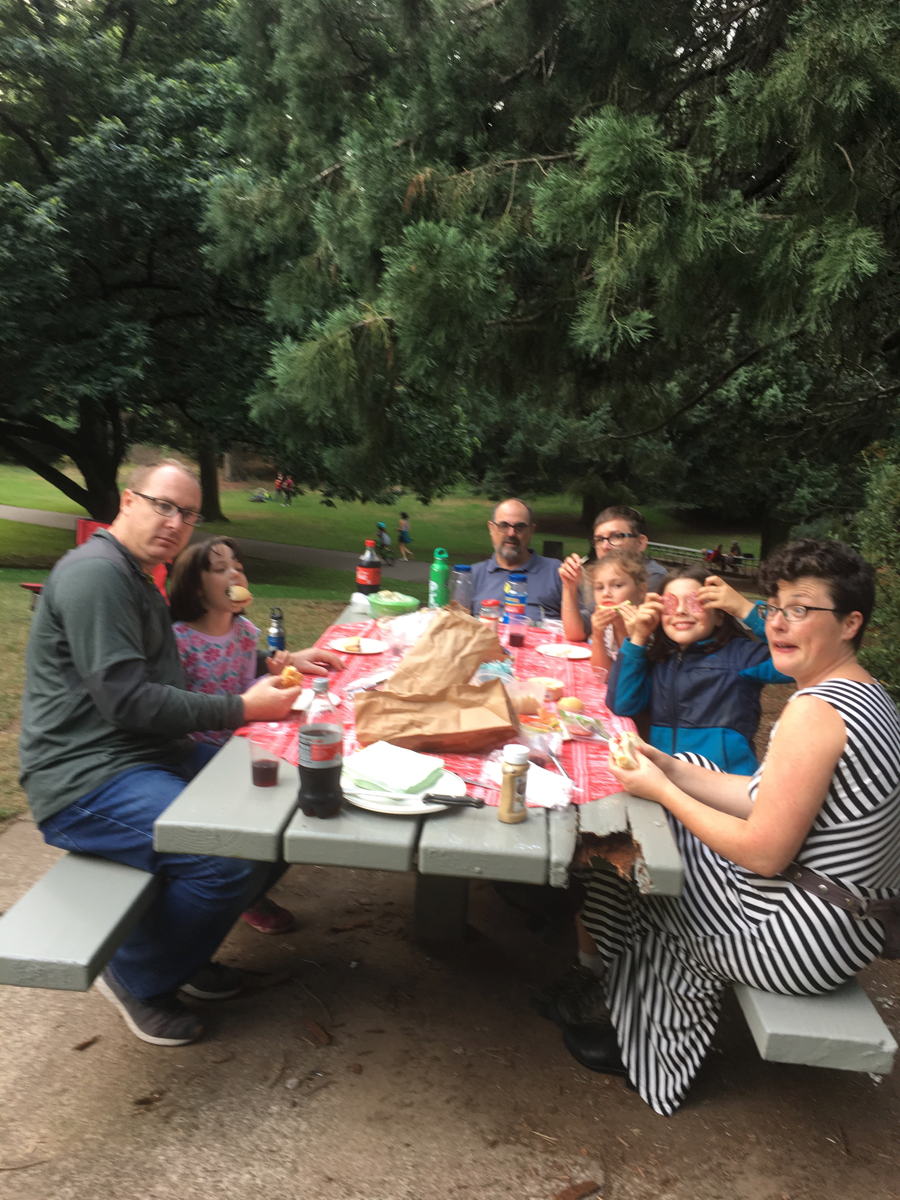 Auntie Katie came over for a picnic dinner with the cousins at Laurelhurst Park. We ate, told stories, and played Frisbee. We managed to get pretty good just before it got dark.