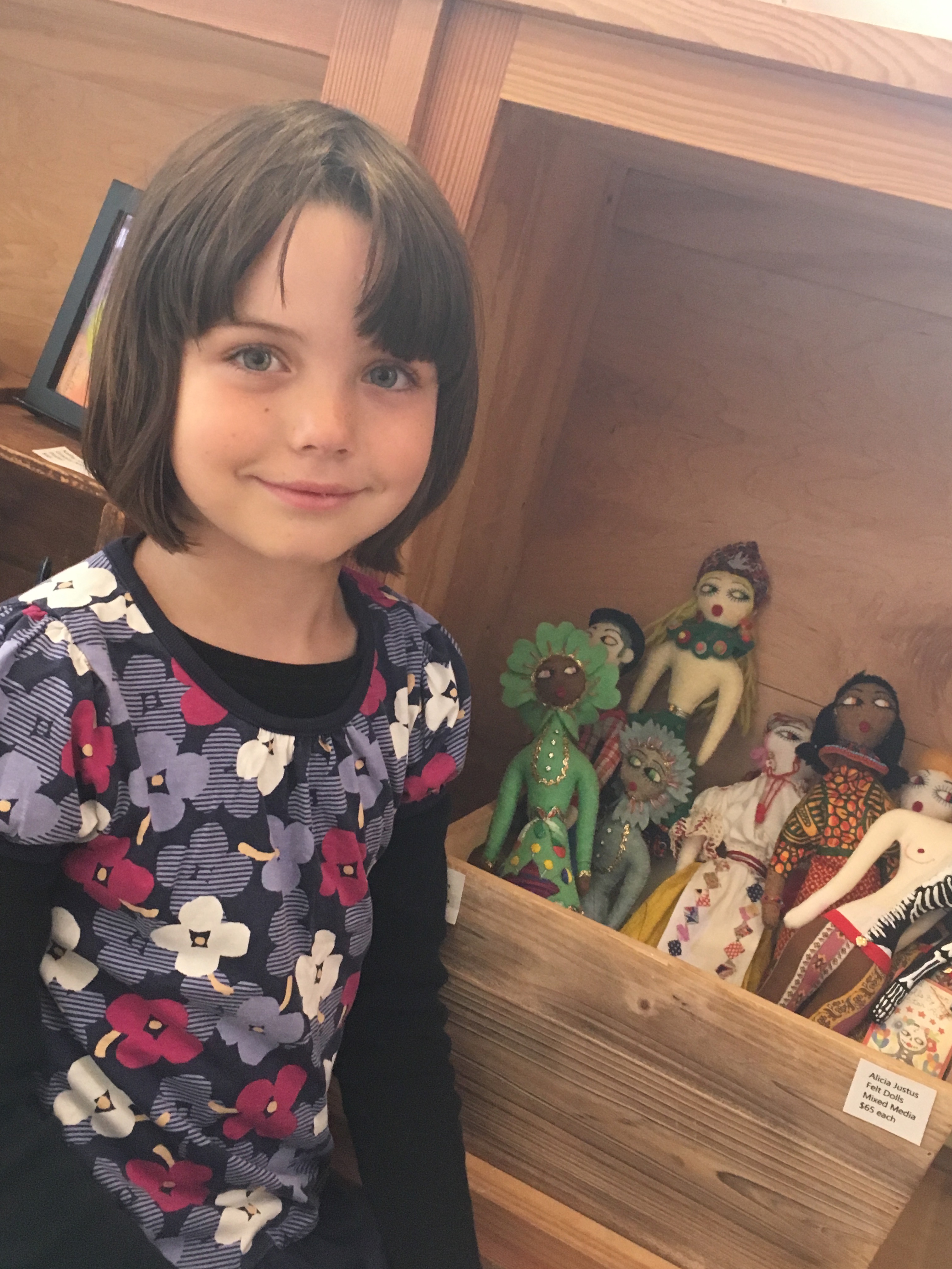 Alicia Justice’s handmade dolls include two Russian ladies that Liza recognized immediately by their traditional dresses. She also loved Gary Hirsch’s giant, cheerful mural on the walls outside.
