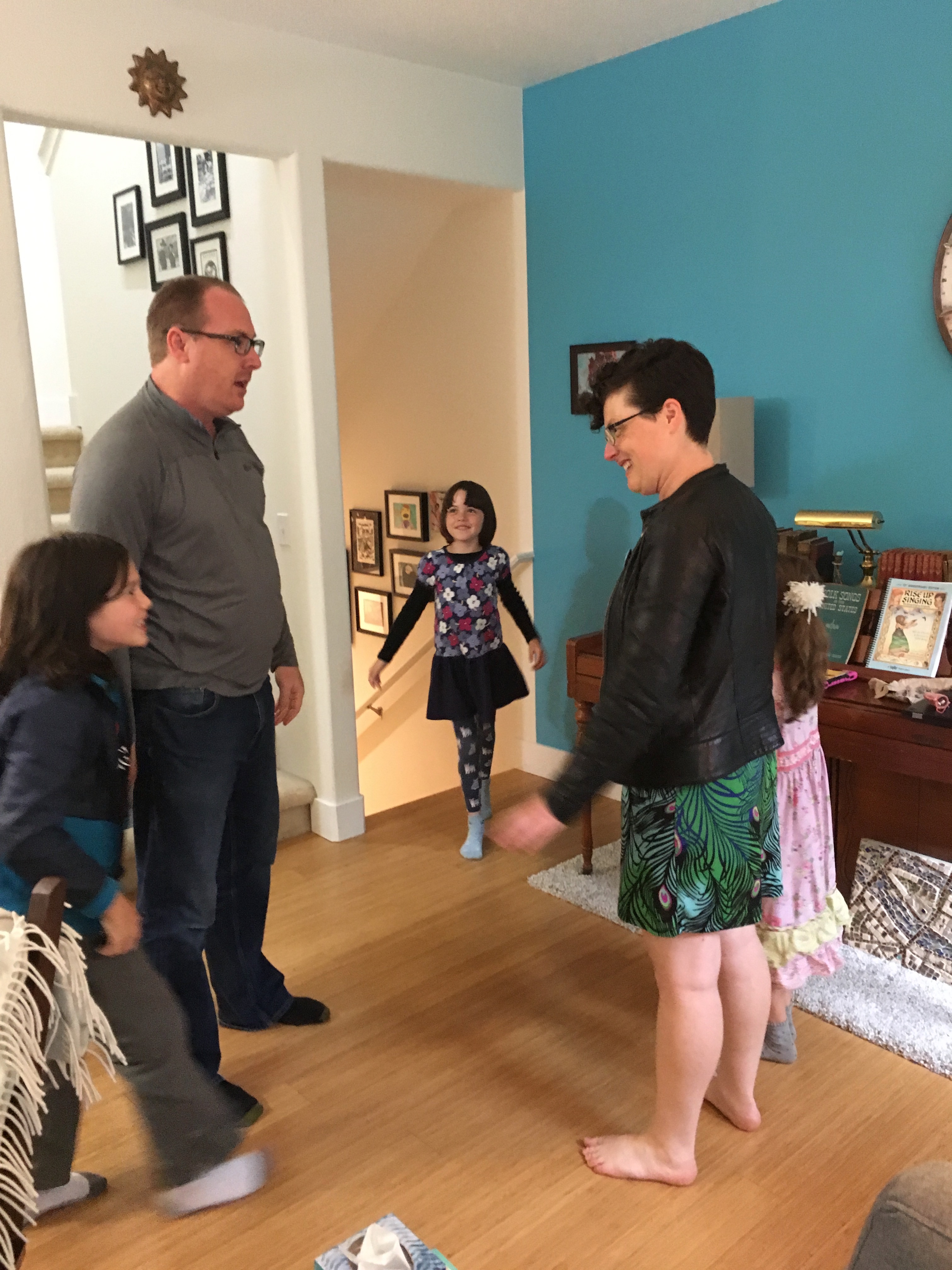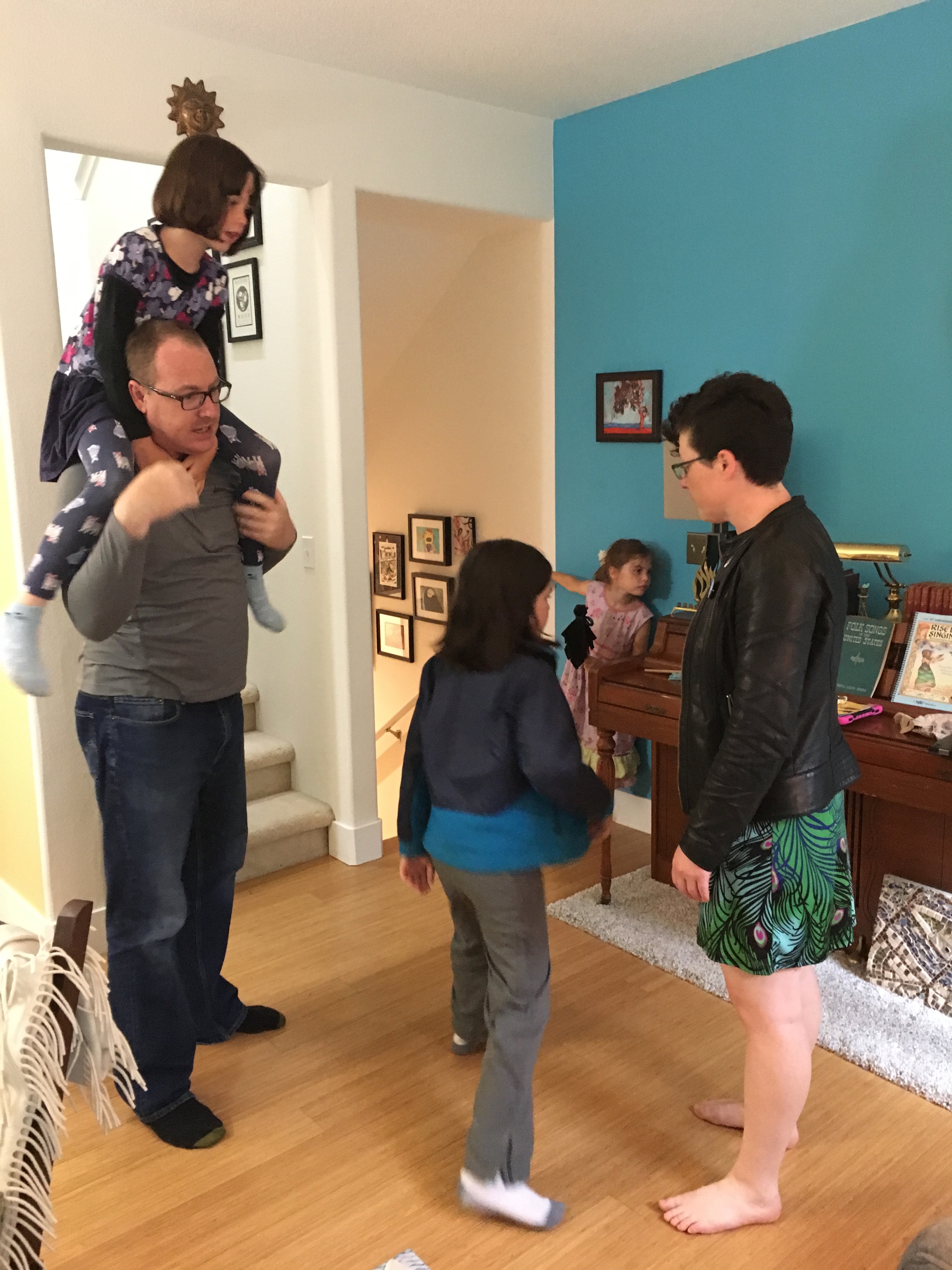 One thing David loves to do is put Liza onto his shoulders, and they’ve been doing it so long it is just one smooth movement. He showed Katie how to do it with Jasper, and Liza heard the ruckus and came up to get lifted, too.