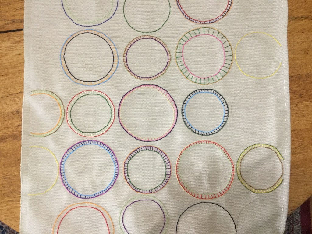 My other project is a pillow. I finished one last year, using fabric I had bought for a “Backpacks for Stuffties” collection that never got off the ground. I like the way it turned out, so started on the coordinating fabric and working in a variation on concentric circles.