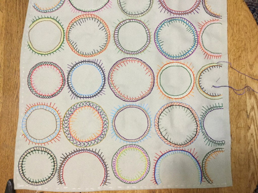 I am just using back stitch, blanket stitch, and a nice V shape called bird stitch in some books. There is still a lot of stitching needed, but I like the direction it is headed. I’ll stop when I think it’s done, ’cause that’s how art is.