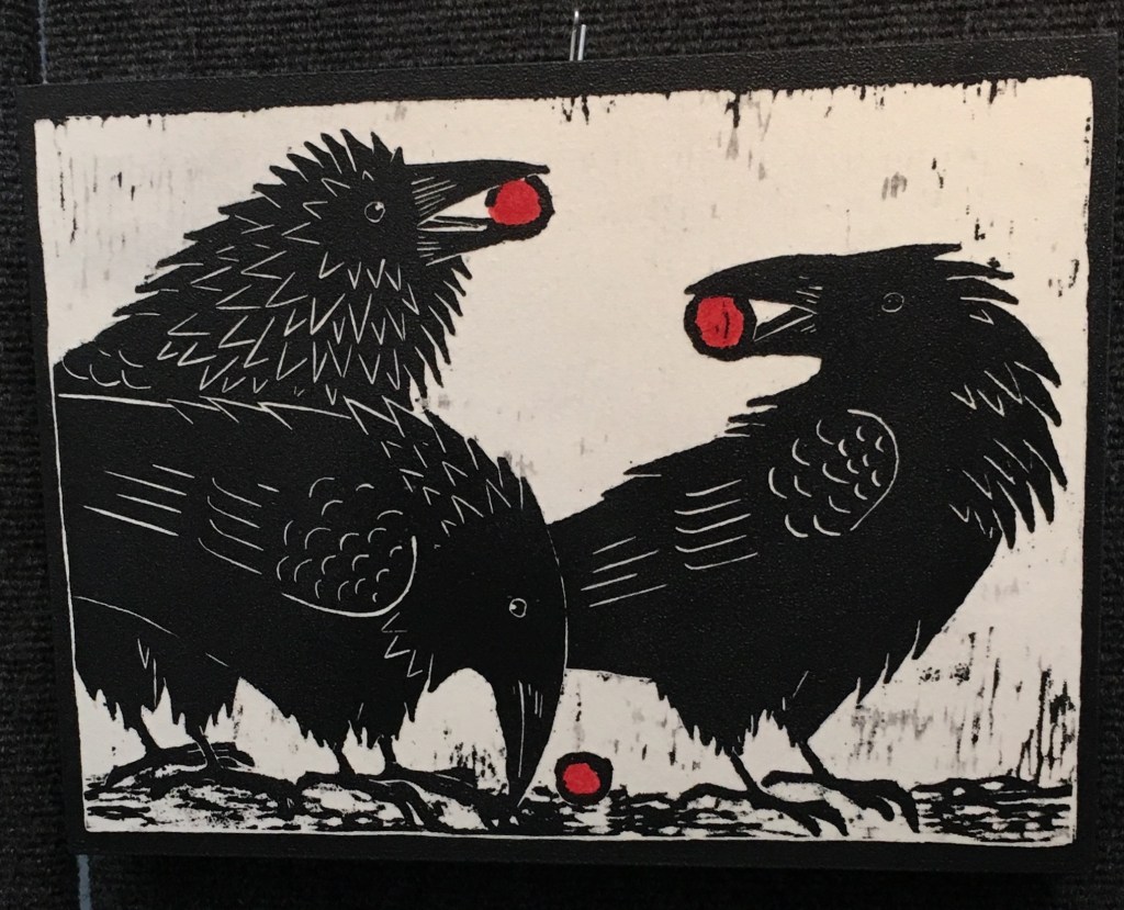 Dona Reed, from Anacortes, Washington, does wonderfully evocative linoleum prints of ravens and loons, with just a touch of red. Her booth was very crowded and she was beaming! This one reminded me of our three person household. Grandpa Nelson is in back, saying “Look what I found!” Auntie Bridgett says, “I like this one!” and I am saying “Oops! I dropped mine…”