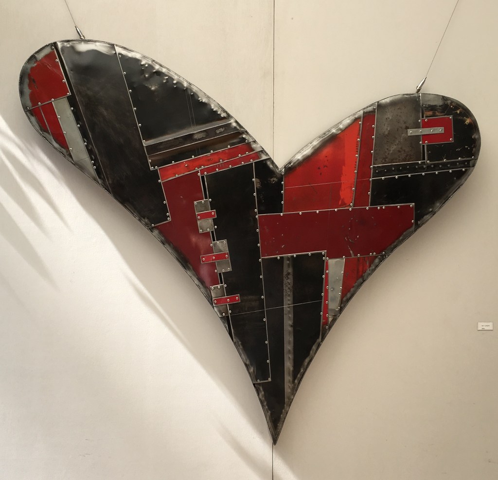 As we continued, I found a booth that reminded me of your Great Grandpa Lowell. Anthony Hansen uses old metal, from cars, factories and license plates to make metal ‘quilts’. They are welded and grommeted together in interesting ways while keeping the original colors.