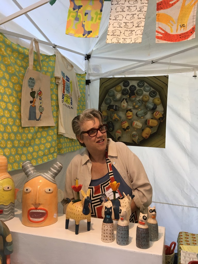 We stopped by Kim Murton’s booth because of the whimsical ceramics but stayed for the fabric prints and conversation. Kim has been part of the Art Fairs in Portland for about six years, she said, and is finally getting her booth the way she likes it. She was very modest, not mentioning that she had designed the tee shirts being sold this year by the Fair. We got the very last one in our size from the Information booth!