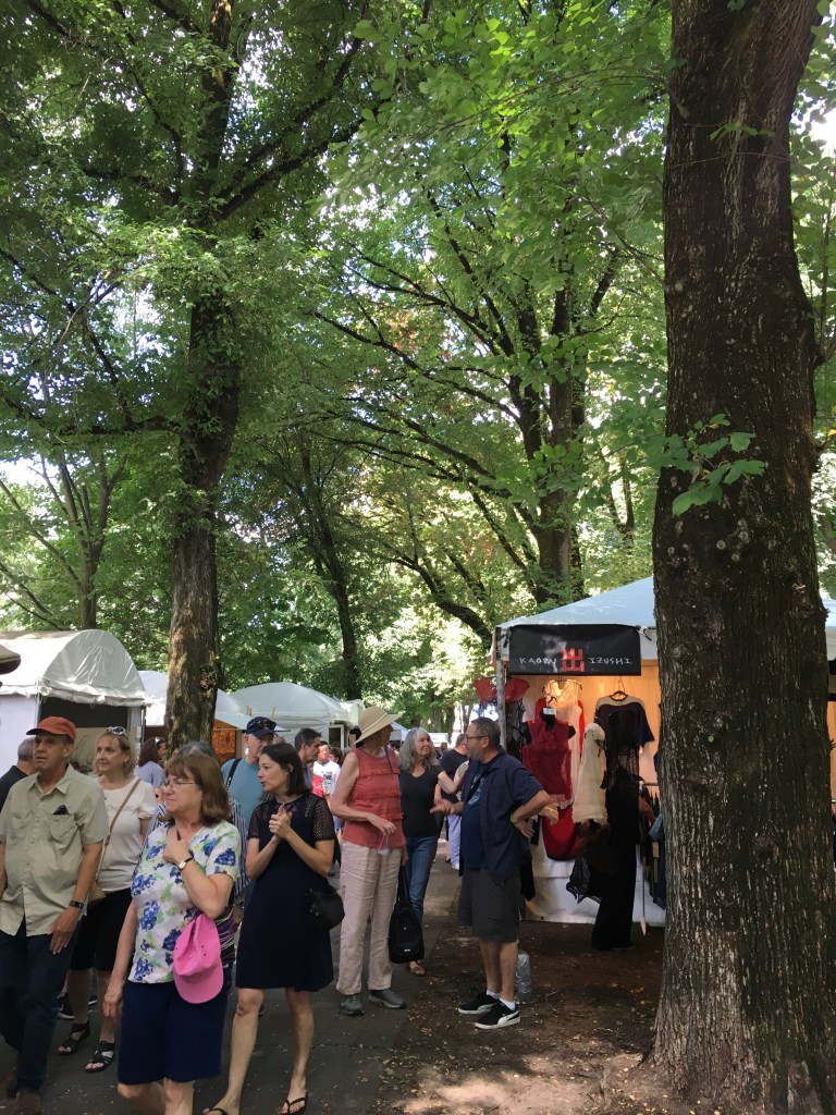 On Sunday, we went to the 22nd annual Art in the Pearl festival in The North Park Blocks. Dozens of art and crafts booths lined one part of the park, and dozens of food booths lined the other. There was a river of people looking, eating, chatting, and enjoying the shady venue.