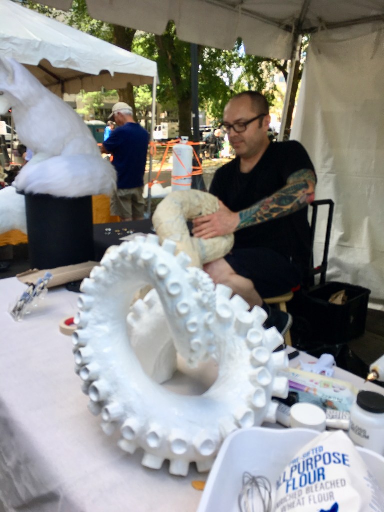 The last artist we visited with was Josh, of Pacific Northwest Sculptors. He works in my own favorite medium, paper mache! He uses flour and paper for the outside and all sorts of things for the armature, even creating a unicorn strong enough for children to sit on! He made this for his daughter, because, he says, “I am not a monster. If I make a unicorn, my daughter should be able to sit on it!” We saw him working on a series of tentacles that just cracks me up.
