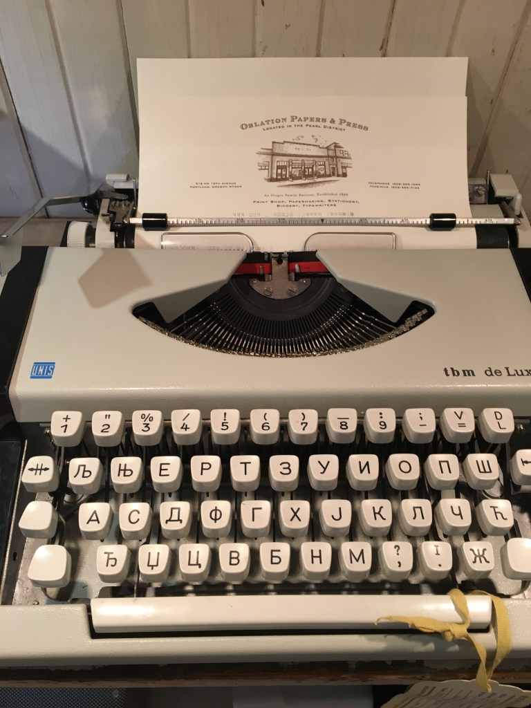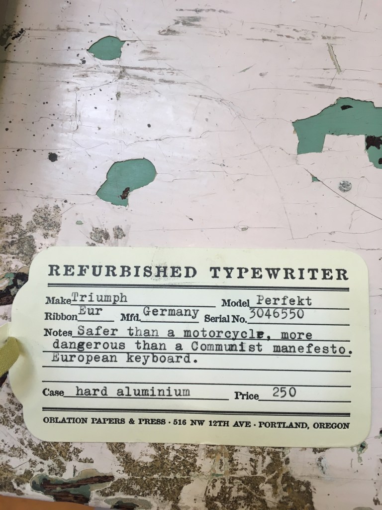 Besides pens, papers, maps, and other such treasures, we found …typewriters!!! Old, mechanical, click-clacky typewriters! They worked, they typed, they smelled just like high school, and I spent way too much time enjoying them. At one time, we owned three of these lovely beauties, but we let them go when we were lightening our load to move. I miss my old Smith- Corona.