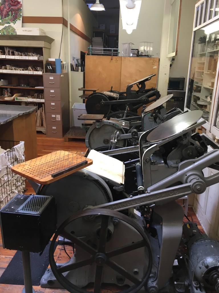 Just behind the typewriters was a real, old fashioned print shop, with half a dozen platen printing presses. They weren’t running when we were there, but I can imagine it would be mighty impressive when they are.