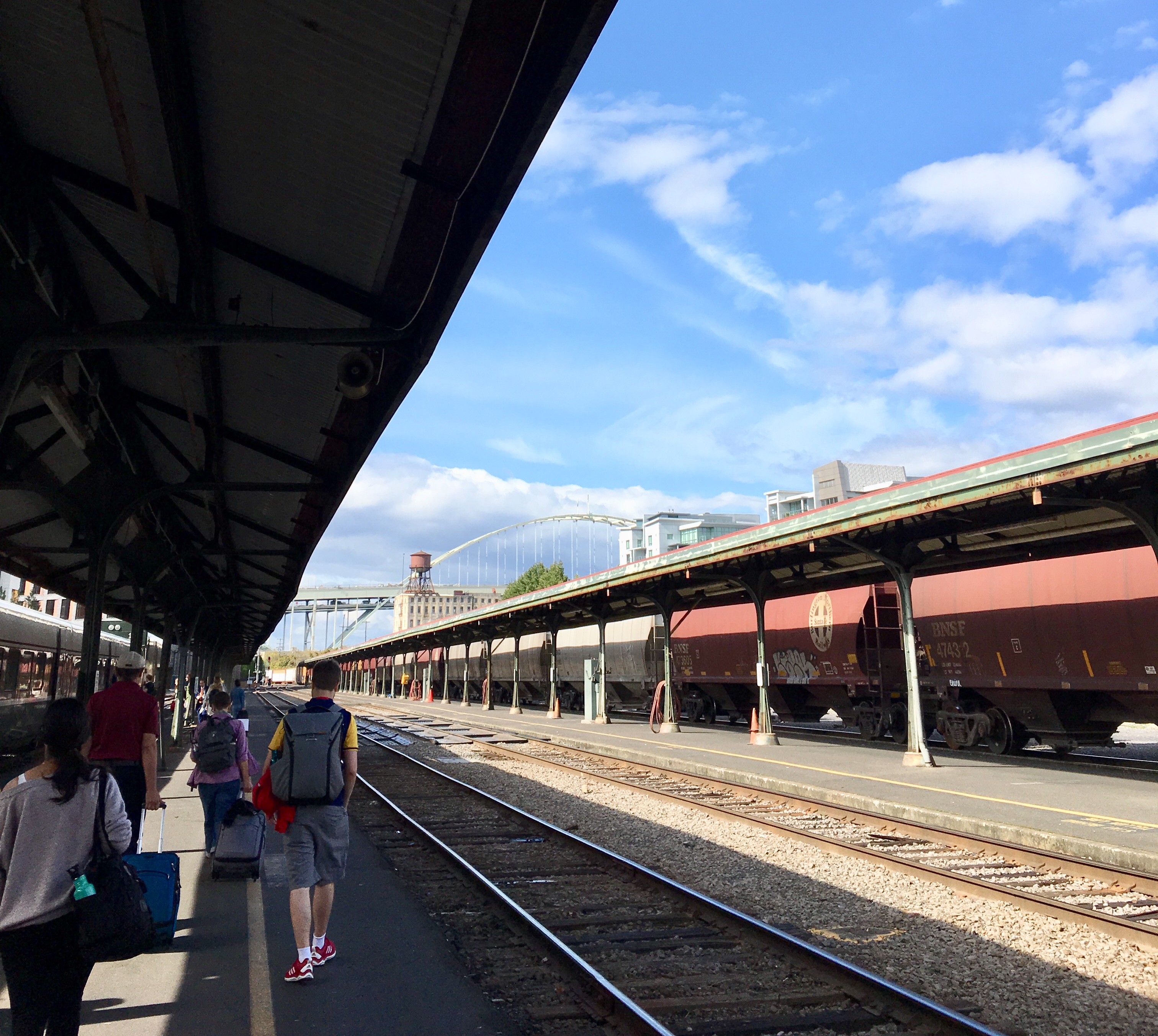 Since the train ran at ground level, we went under as many bridges as we went over, and as the sun went down and the light changed, we lived for the occasional flicker of a city or reflections on the Puget Sound.