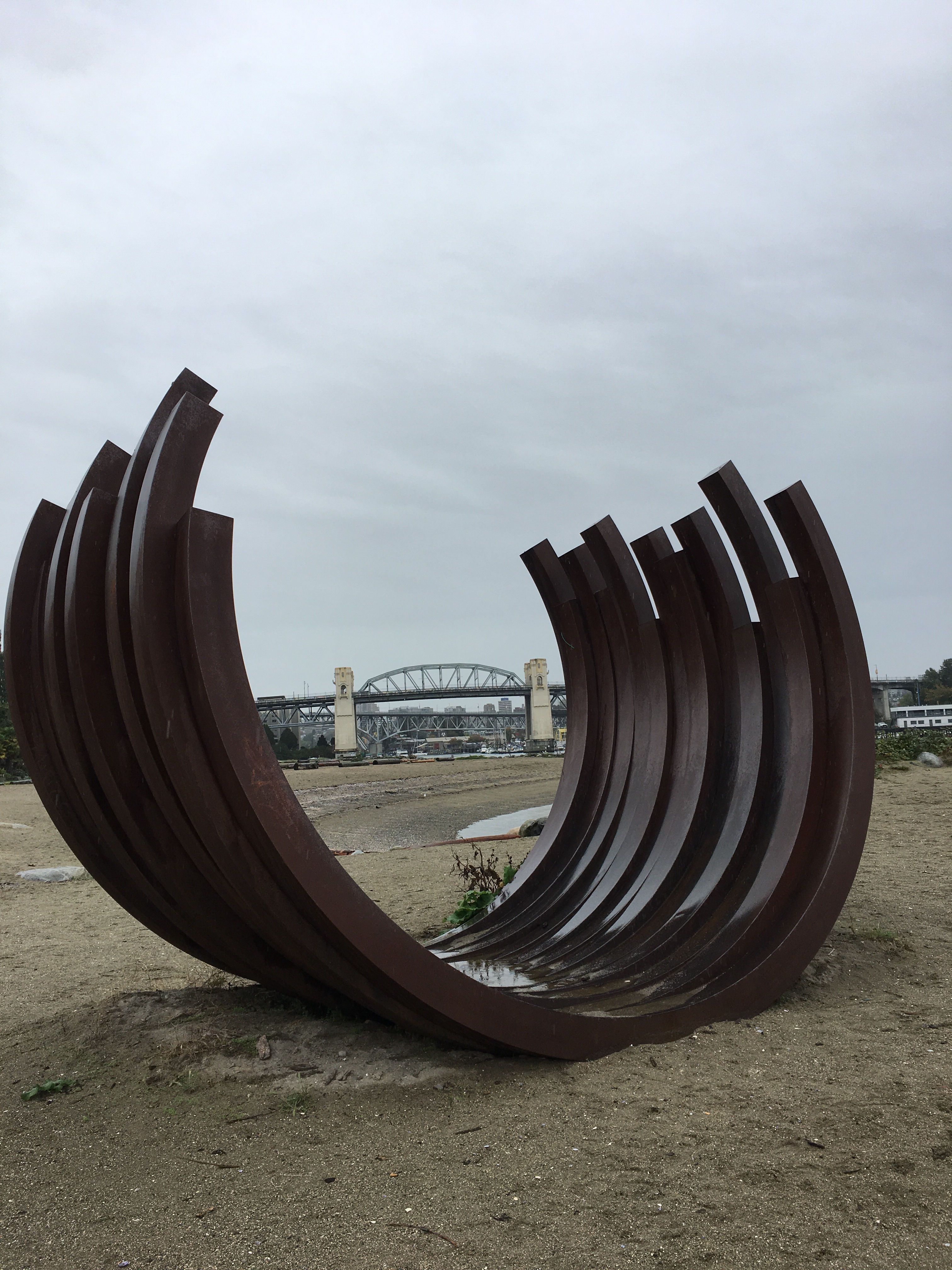 I stopped for a good look at memorials and sculptures off the path, like this “is it whale’s ribs or ship’s ribs?” sculpture placed right on the sand. Turns out, it is called “217.5 degrees x 13”, a reference to the curve itself. I like the way it frames different views of the harbor.